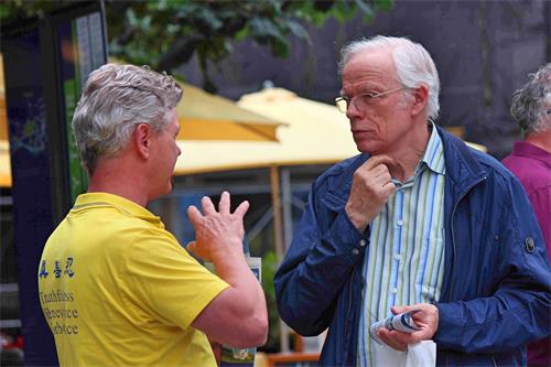 有的路人直接询问学员:“我在哪里可以签名?”有的鼓励学员:“你们在这里做的这些太好了!”“请坚持下去!”“我支持你们!”还有的和学员交谈,询问更多的讯息:“在中国,法轮功学员的器官还在被掠夺吗?”