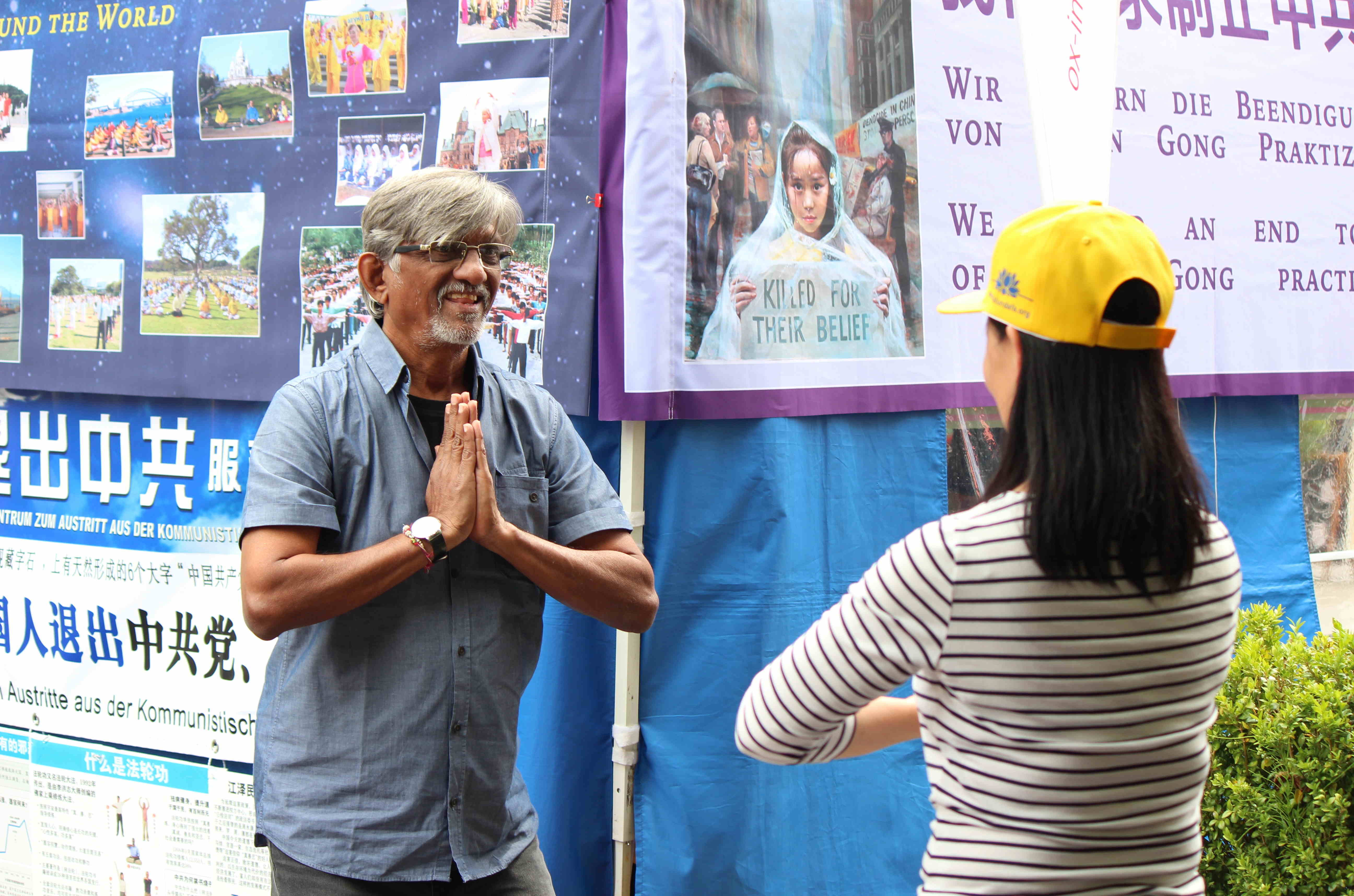 一位上了年纪的女士看到莱拉在学功时也很感兴趣,在得知可以马上学功后,当即就一起学炼。另一位来自印度的游客也驻足认真学炼,直到他的亲人来找他时,才意犹未尽的离开。一位当地报社的记者多次来到信息摊位,并表示自己也要学炼法轮功。