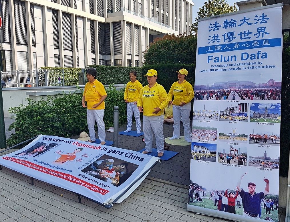 当天,由于高温,在杜赛尔多夫有些学校停课。在烈日下,学员们演示了五套功法。许多民众都被学员们平和的炼功氛围吸引,不少人主动找到学员,了解法轮功。