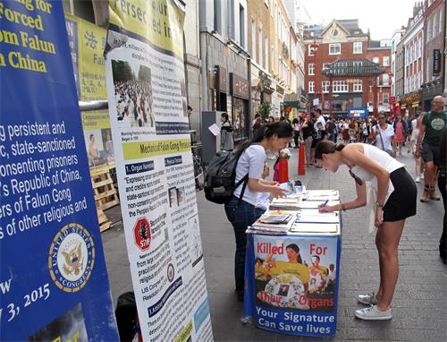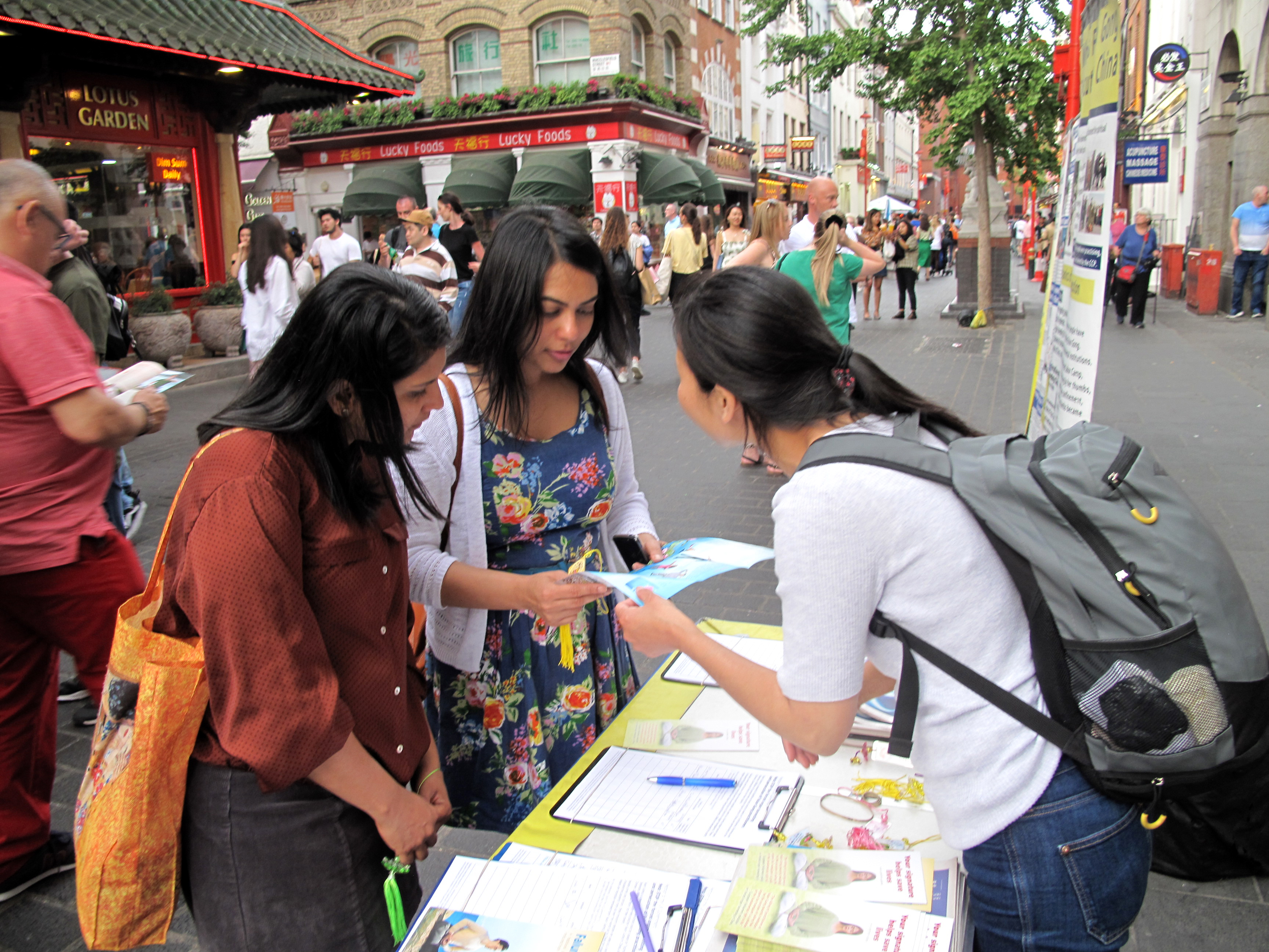 傍晚七时左右,法轮功学员温迪来到伦敦唐人街,在大约半个小时里,温迪向十几位(组)游客和民众面对面讲真相,她高兴地发现,来自世界各地的人们都有兴趣了解法轮功,他们对法轮大法教导的“真善忍”理念表示赞同支持,越来越多的人明确表示要去学炼法轮功。