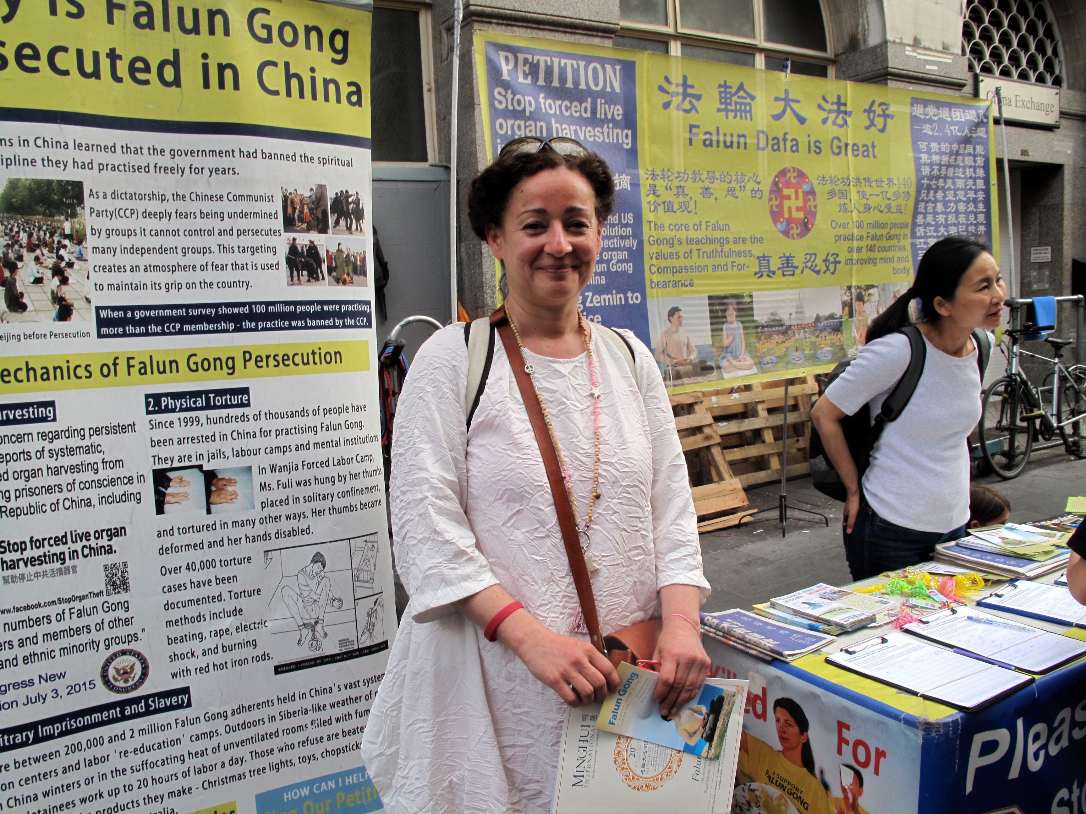桑西姵(Xanthippe)是基督徒,父母是希腊人,她出生在比利时,但她对东方古老文化感兴趣,学习过印度和日本的一些东西,练习并教授打坐和精神疗法有二十年历史了。六月一日她与家人来唐人街游览时看到法轮功学员展示的真相,她对中共残酷迫害法轮功的事实感到震惊,在签名反迫害后向温迪和其他法轮功学员进一步了解功法,温迪送给她一本英文《明慧周刊》。