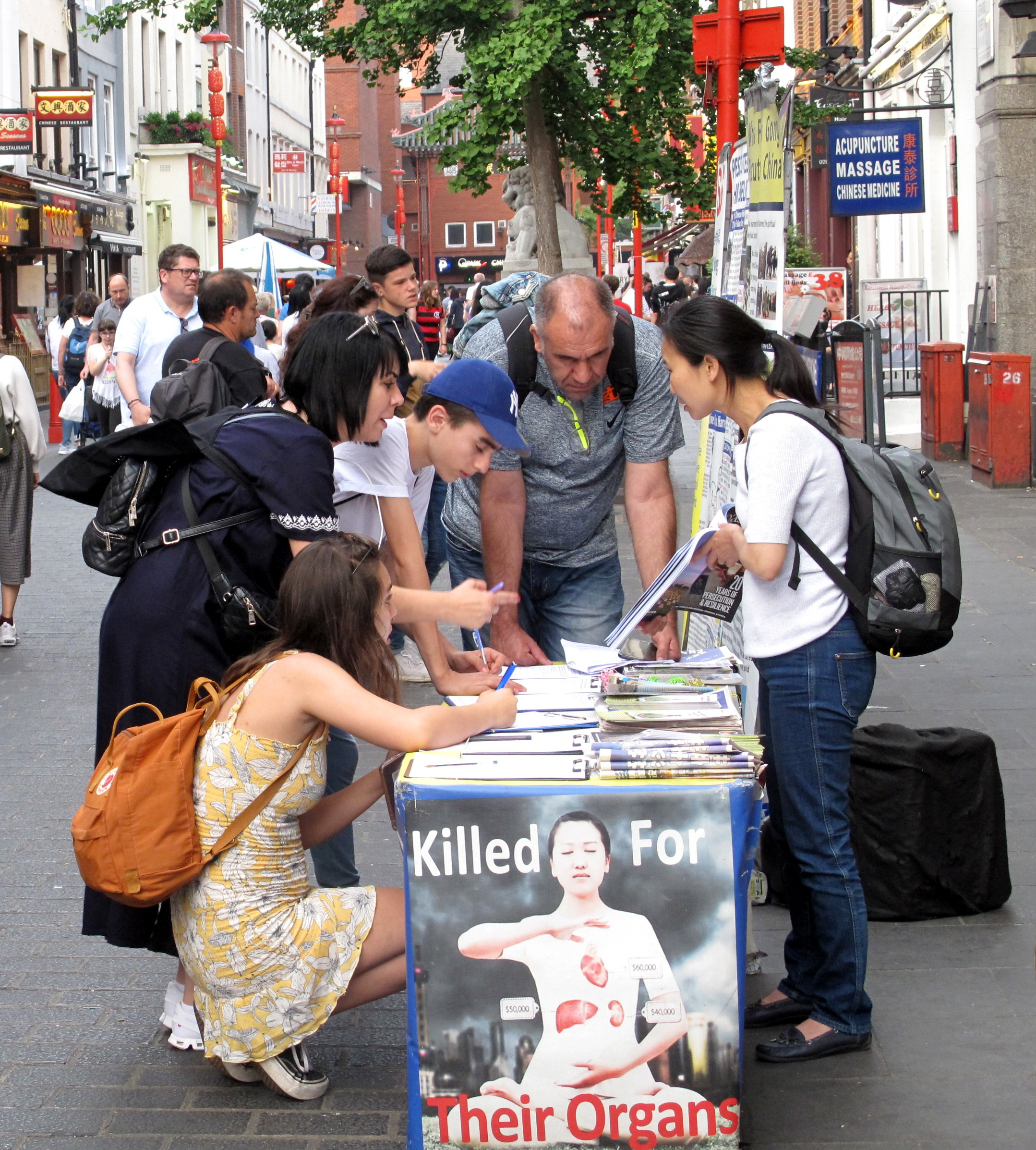 ![]() 图6:二零一九年六月一日,来伦敦旅游的以色列一家四口人在伦敦唐人街一起签名支持法轮功反迫害,法轮功学员温迪向他们讲真相。 |