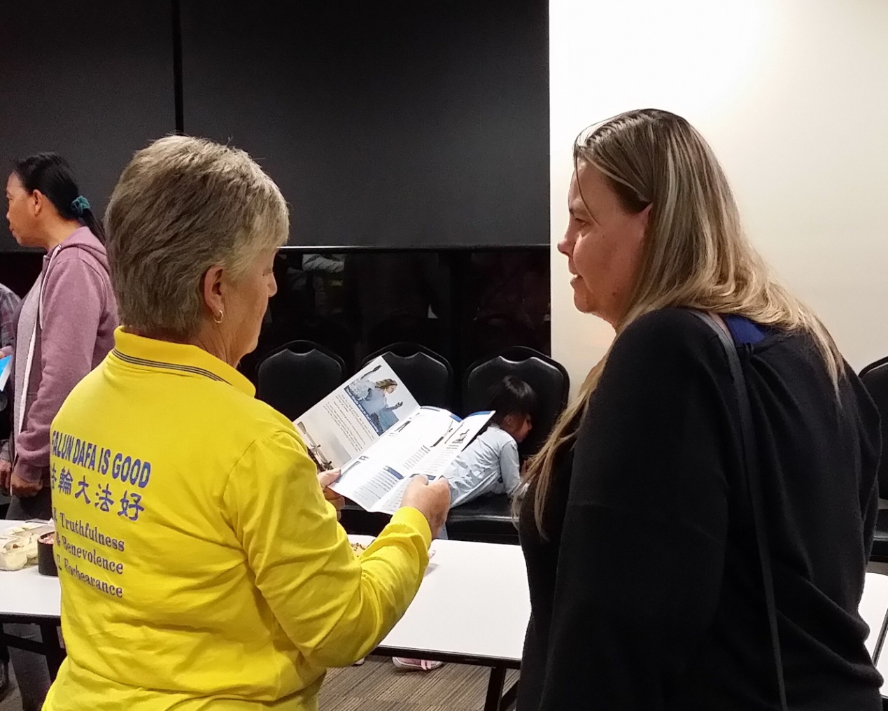 最后,在大家互动交流中,有一对上了年纪的夫妇带着他们的孙女一起来参加当晚的活动。丈夫麦可木·瑞斯顿(Malcom Ralston)身体不太好,妻子瑟瑞帕·瑞斯顿(Siripa Malston)当场就请了本英文版的《转法轮》决定回家和丈夫一起阅读,他们还说以后一定要坚持炼功,希望他们能有一个健康的身体。