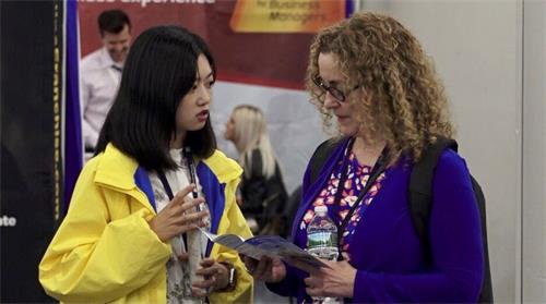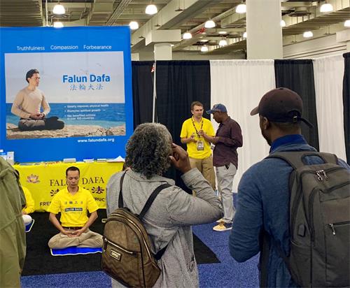 大多数人们都能听完整个介绍而且很赞同,纷纷感谢学员们分享这个美好的信息给大家。也有些人不敢相信学炼法轮功是完全免费的,这应该是这个展会中唯一一个免费的服务了。很多人来自美国的新泽西州、加利福尼亚州、华盛顿州、德克萨斯州等,也有来自其它的国家和地区,有的人拿了纽约炼功点的列表,有的现场学功,有的要报名参加天梯书店的九天班,有的现场买了大法相关书籍和教功光盘。