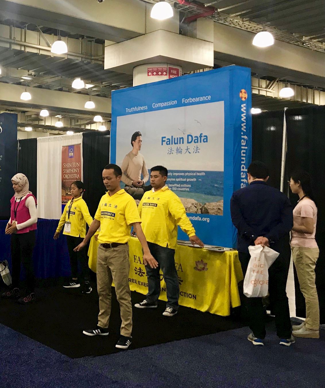 学员们在展位上祥和的打坐展示功法,吸引了很多人的驻足和拍照,人们很好奇:“这是什么加盟店?”学员们递上传单解释到,“这不是加盟连锁,这是免费的打坐锻炼,可是你们可以把这个打坐用做你们的员工福利,五套功法能让人缓解压力和焦虑,增加能量和智慧;因为强身健体的效果显著,已经弘传了一百多个国家和地区。如果你们需要,可以联系你们附近的炼功点联系人,他们会很乐意去你们公司为你们员工教功,而且是免费的。这样你们的员工得到了充分的放松,就能更好的集中精神工作。更重要的是,法轮功教人按照‘真善忍’做个更好的人,如果你的员工都是好人,那员工会努力工作公司效益也会提高。”