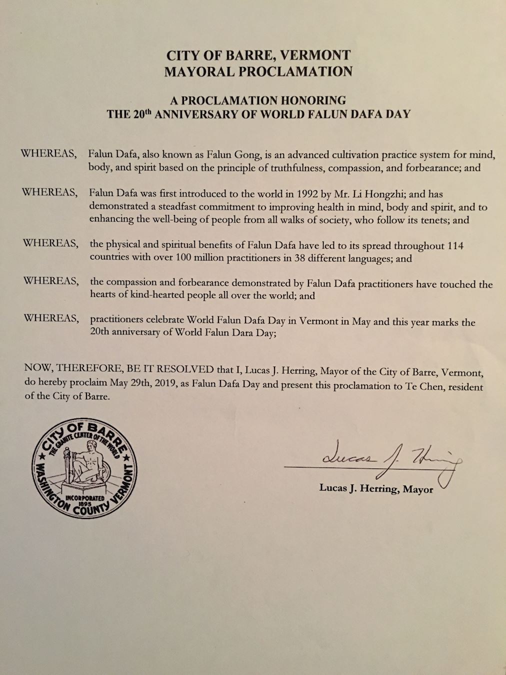 鉴此,我,卢卡斯·何瑞,巴尔市长宣布二零一九年五月二十九日为佛蒙特州巴尔市的“法轮大法日”