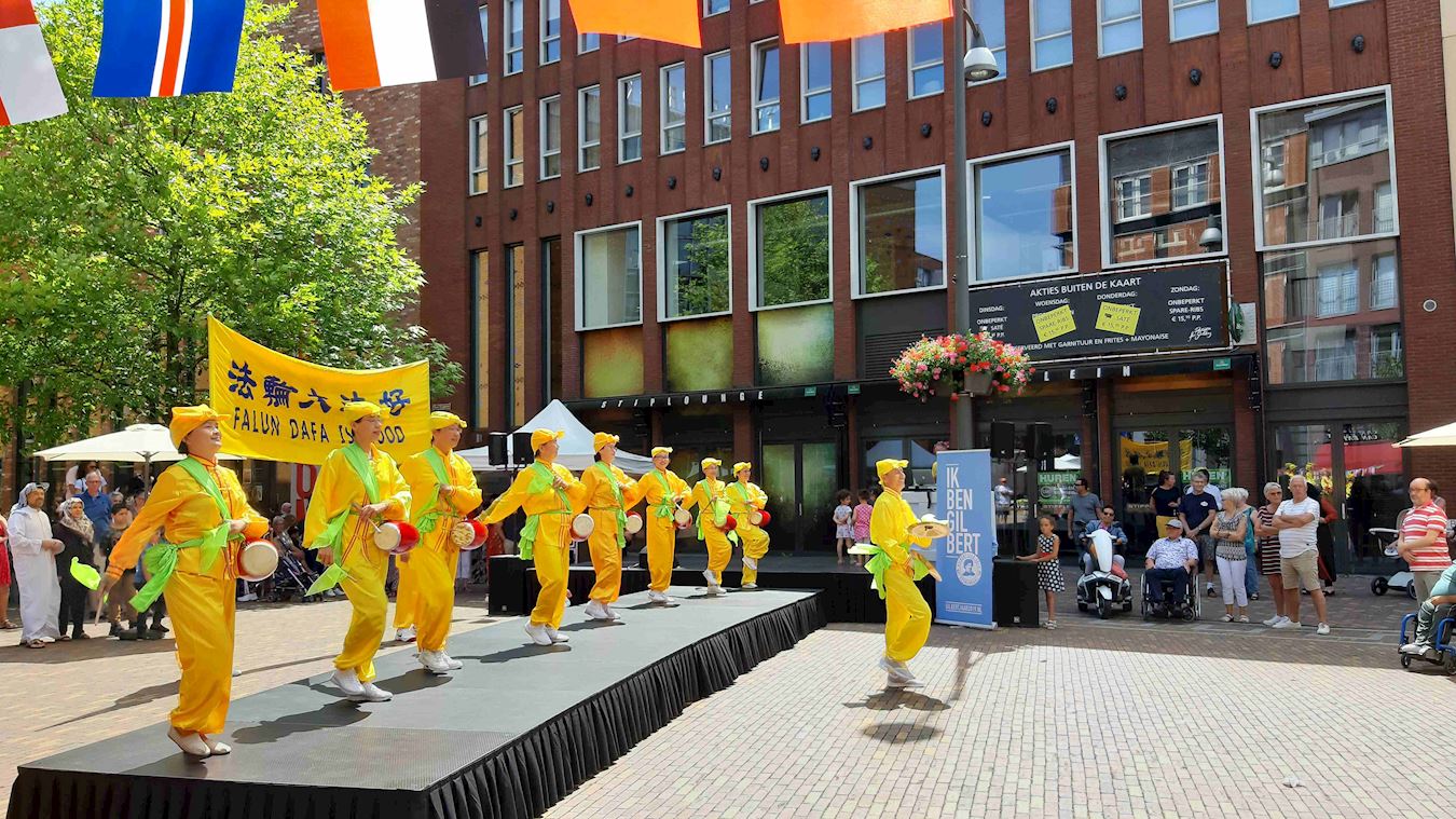 九名法轮功学员组成的腰鼓队身着传统服饰,轻松愉快的打击风格也符合荷兰人开朗的性格,有的民众附和着鼓点,小朋友们更是随着鼓点蹦跳起来。
