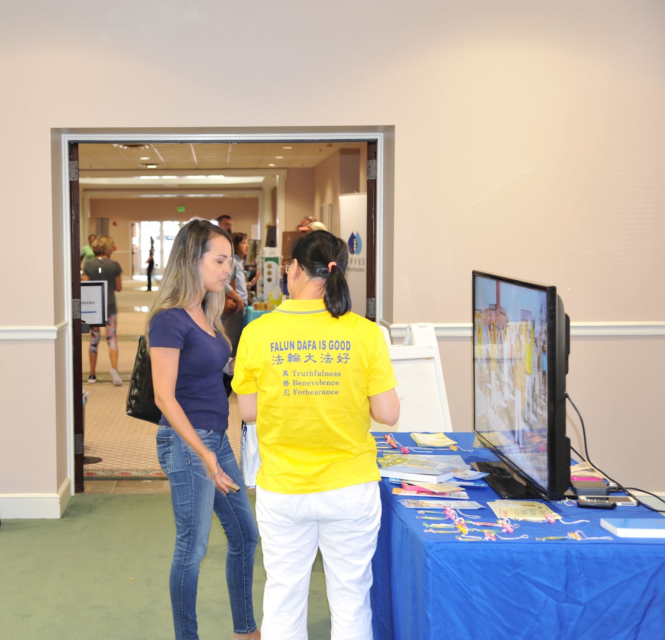 也有部份法轮功学员在舞台下,将自制的小莲花和法轮功真相资料分发给现场各族裔的观众。有的民众接过真相资料后马上认真阅读。当人们得知法轮功学员被中共活体摘取器官贩卖的事后感到震惊。朱丽亚(Julia)女士表示,“活摘器官”这个事情她觉得太可怕了,曾经有人告诉她中共很坏,但是没想到如此的邪恶。