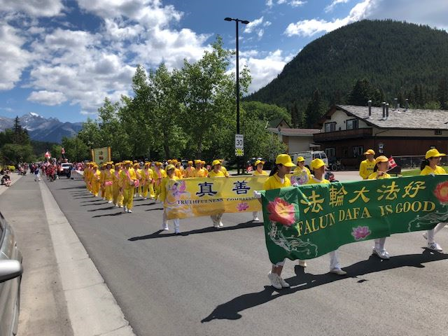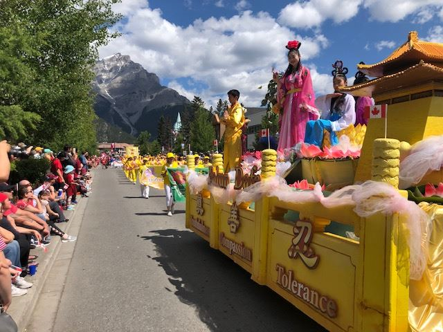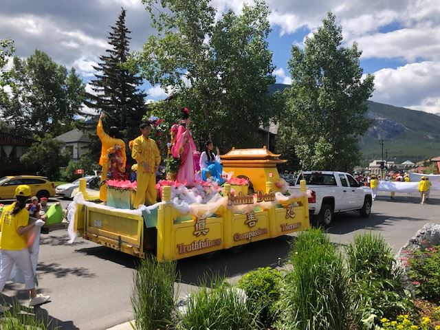 11点游行开始,来自世界各地的游客和班芙地区及附近小镇的人们早已挤满了主要街道的两旁。阳光下金黄色法轮功花车显得格外耀眼,加上身着金黄色服装的法轮功腰鼓队学员,配上粉色鼓带,在蓝天青山的映衬下显得端庄秀美。