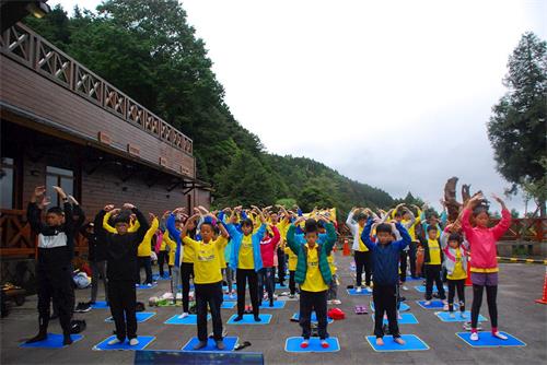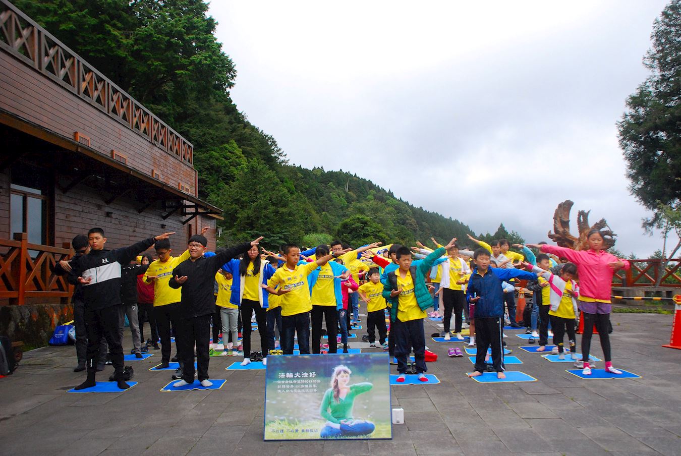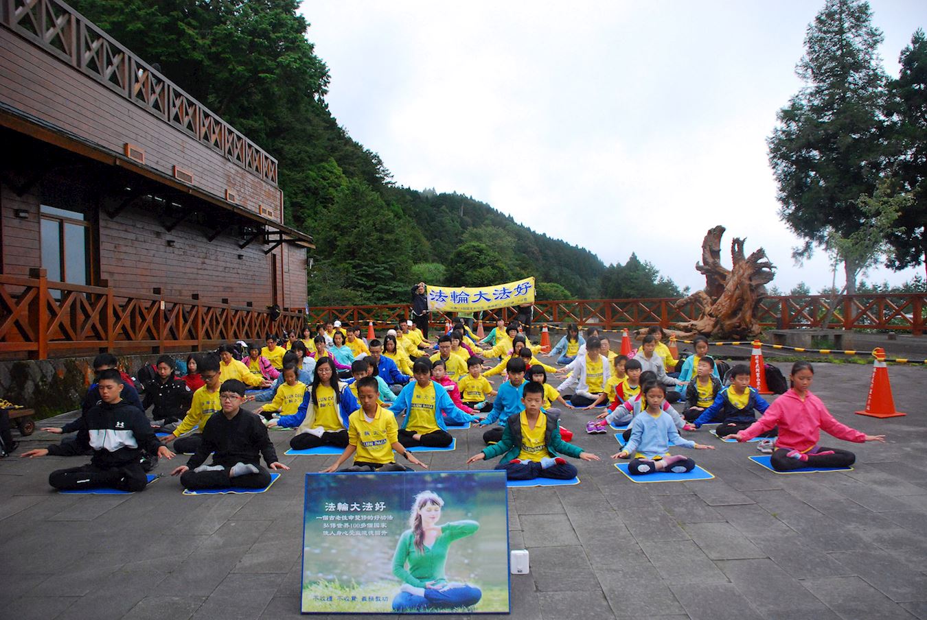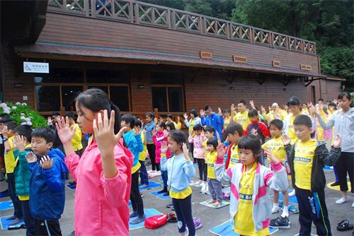 学员们带着小弟子从沼平车站沿着森林步道,走过神木区,经过木兰园,来到游客必经的受镇宫,用了简单午餐后,在广场上微雨中仍然展开功法演炼,旁边午餐休憩的游客纷纷好奇观看。功法演炼后,学员及小弟子开始向游客发大法资料及纸莲花。