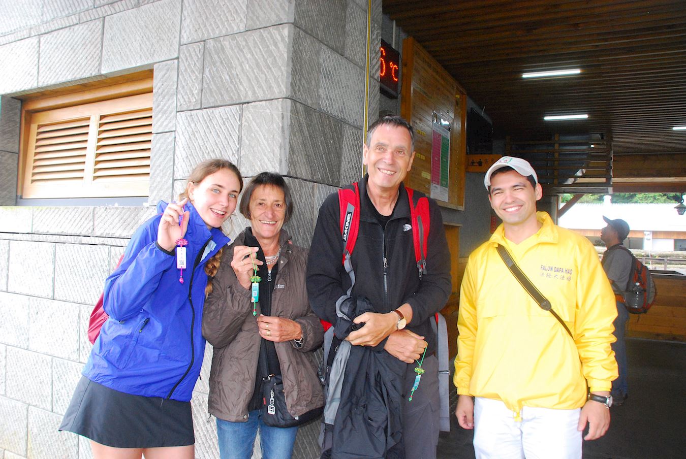学员阿忠向来自比利时的三位游客发大法资料,他们表示第一次听到法轮功,阿忠解释说:“法轮大法从一九九二年至今,已洪传世界一百多个国家和地区,上亿人修炼,法轮功主要著作《转法轮》被翻译成三十九种语言文字,在亿万修炼者中,有平民百姓、专家学者,也有高官富贾,他们通读法轮大法的著作并按照大法教导的真善忍提高自己的心性,修炼五套功法,道德升华了身心也净化了,在大陆却受到毫无人性的迫害,你们听说过活摘器官吗,被杀害的大多是修炼法轮功的好人。”