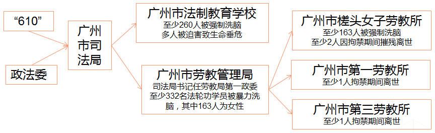 广州市司法局于二零零一年四月三日非法设立了专职洗脑机构——广州市“法制教育学校”(广州市洗脑班)。在广州市司法局官方网站的信息公开栏目中,广州市司法局“二零一一年部门预算编制说明”中明确写着资金去向:市“法制教育学校”扩容改造项目经费156万元。二零一二年十一月十二日广州司法网公布的广州市司法局行政职能之一是:管理市“法制教育学校”。