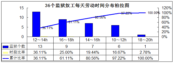 依据明慧网的相关文献,对36个样本,即36家奴工场所(包含监狱、看守所、戒毒所和已经解体的劳教所)奴工每天的“工作”时间统计显示,奴工们每天要被迫10~20小时不等的恶劣奴役,当“生产任务繁重”时,奴工们几天几夜不得合眼。其中,奴工每天被迫“工作”12~14小时的监狱最多,占统计比率的36.11%;其次是16~18小时,占25%;位列第三的是14~16小时,占19.44%,三个时间段累计占总样本数的80.56%。[161]