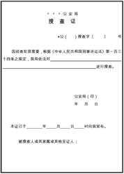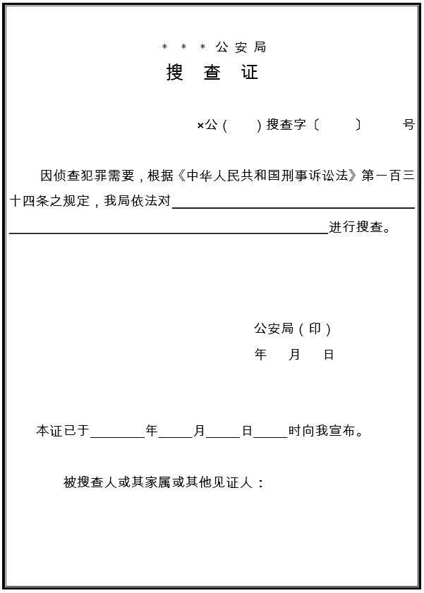 下图是搜查证的样本,一个是存根,写明搜查的原因和填发人、批准人等,另一个是搜查证,明确要求宣读给被搜查人或家属或其他见证人。