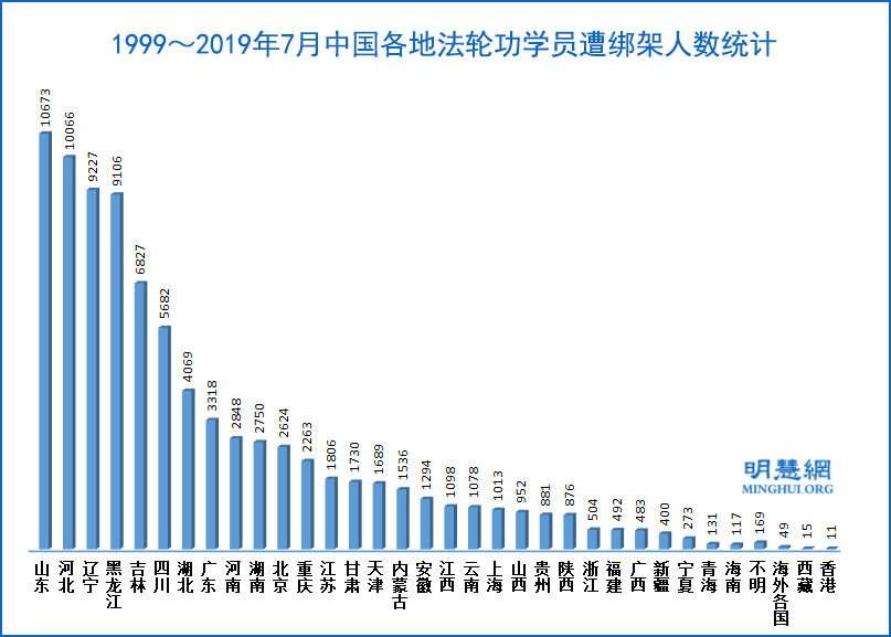 ![]() 图:1999~2019年7月中国各地法轮功学员遭绑架人数统计(数据统计截至2019年7月10日,其中“海外各国”指从海外回中国大陆而遭中共绑架的法轮功学员人数) |