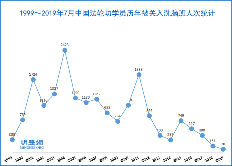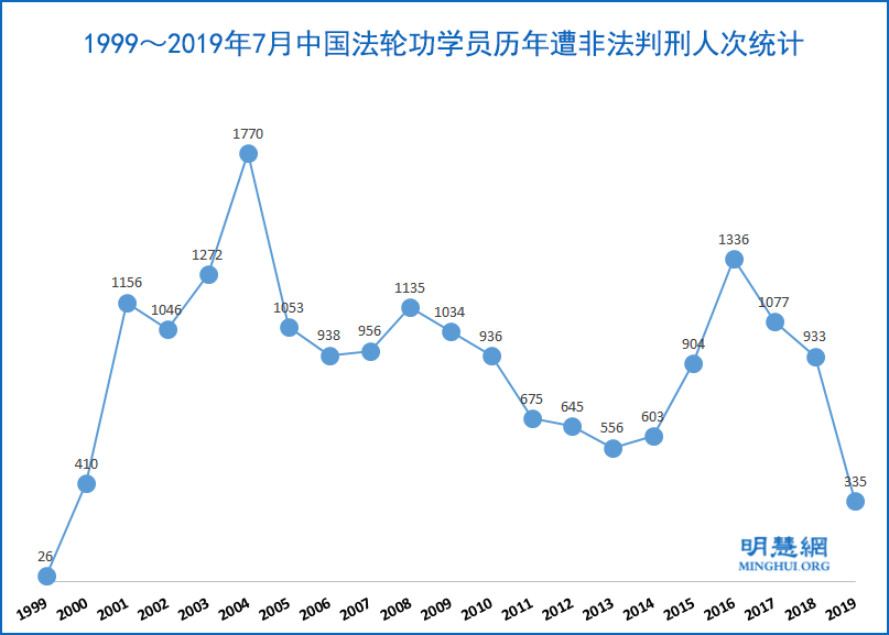 ![]() 图:1999~2019年7月中国法轮功学员历年遭绑架人次统计(数据统计截至2019年7月10日) |