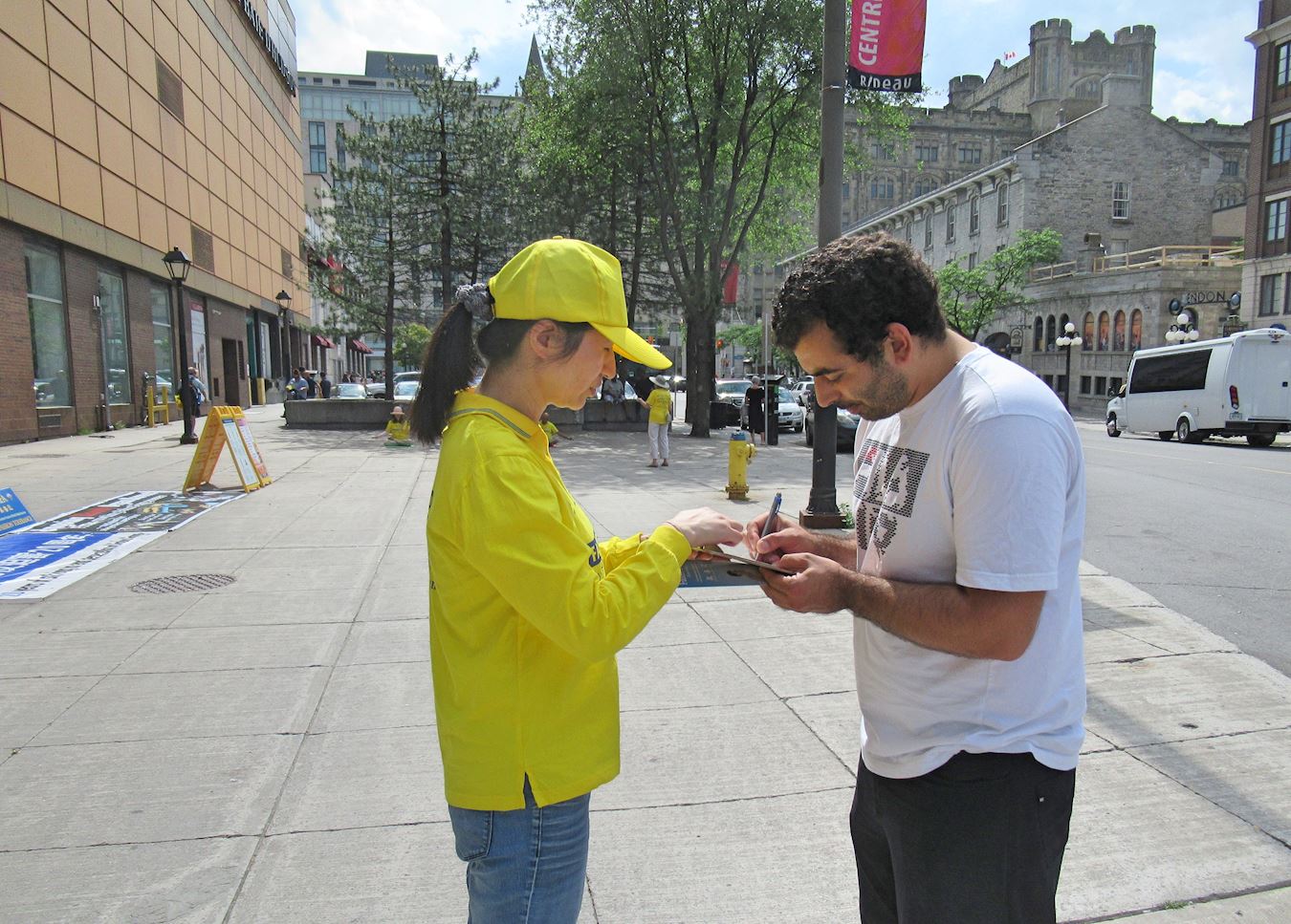 今天看到法轮功学员在这里的活动后,他说:“让人们知道(迫害)很重要。我每次经过中加使馆前时都能看到他们。现在这里的每个人都能看到他们。 ”他希望加拿大政府帮助制止迫害,于是在寄往加拿大外交部长的请愿明信片上签名。