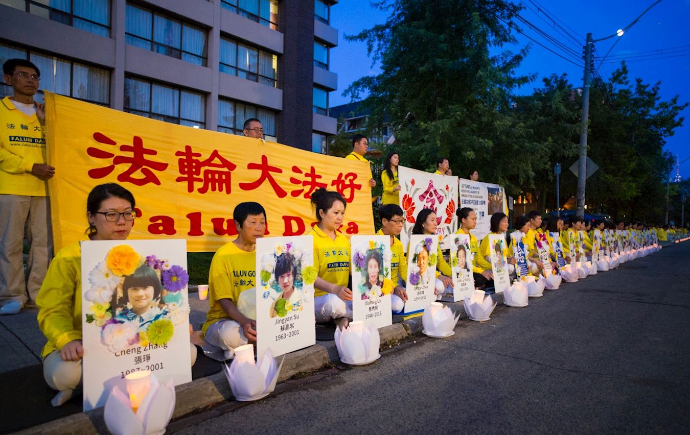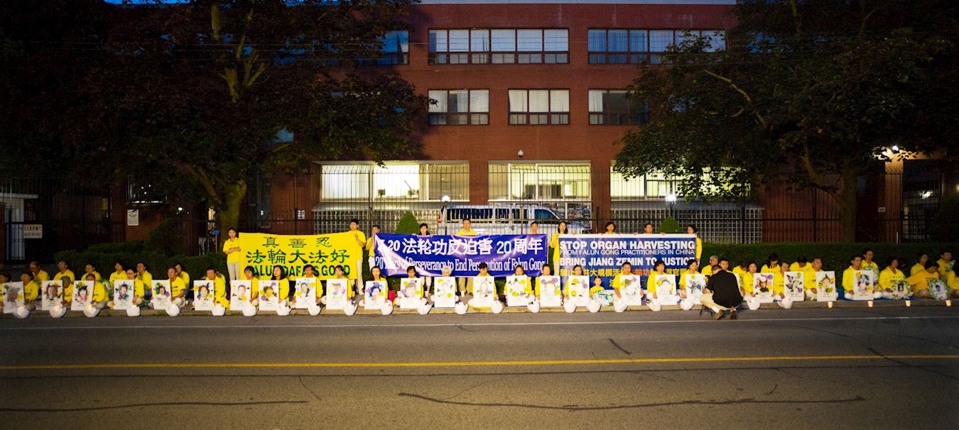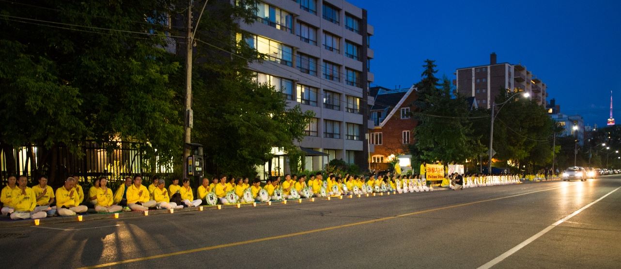二零一九年七月十三日晚八点至十点,多伦多法轮功学员在中领馆前举行了反迫害二十周年烛光悼念活动,他们比邻而坐,汇聚善念,悼念被中共迫害致死的中国大陆法轮功学员。