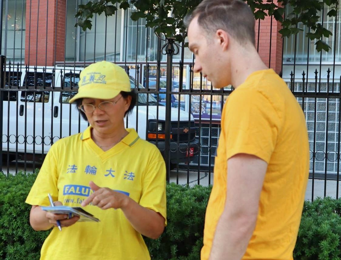 多伦多居民杰西(Jesse)经过现场时,接过法轮功学员递上的一张真相传单说:“谢谢,我很感兴趣想了解一下这是什么。”听完介绍后他说:“这是我第一次听说法轮大法。从我了解到的来看,法轮大法是有积极的能量,并且使人变得很积极,提升健康水平。”