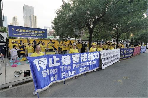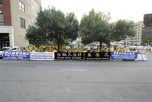 法轮功学员打出“法轮大法好”、“法轮大法教真善忍” 、“中共活摘法轮功学员器官天理不容”、“解体中共制止迫害”等中英文横幅,集体炼功及集会。