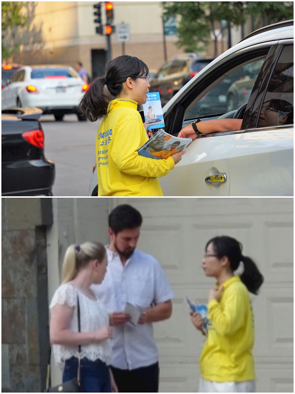法轮功学员活动的场面吸引了不少路人的注意,有的拿出手机拍照,有的认真阅读横幅上的文字和展板,很多人接到了法轮功的传单并了解法轮功被迫害的真相,他们问道“我们能做些什么”来帮助停止迫害。