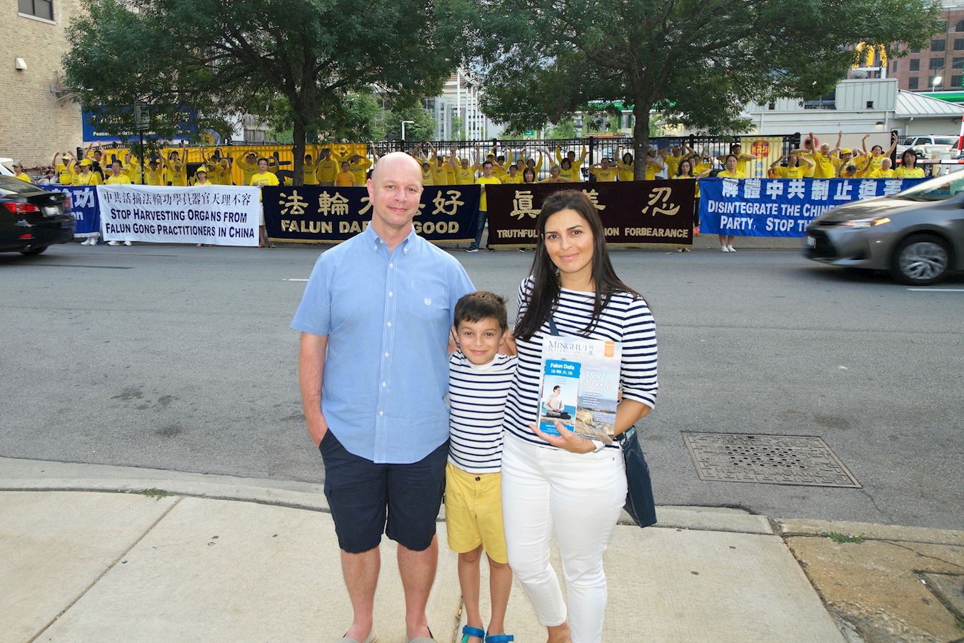 来自密西根州的伊斯梅尔·德雷珀(Ismael A Draper)和家人刚好住在中领馆附近的酒店,她表示这是第一次听说“法轮功”的名字,听到法轮功学员讲述中国大陆发生的迫害时,她的眼中闪着泪光,她祝法轮功学员好运,并希望能帮助停止这场仍在持续的迫害。
