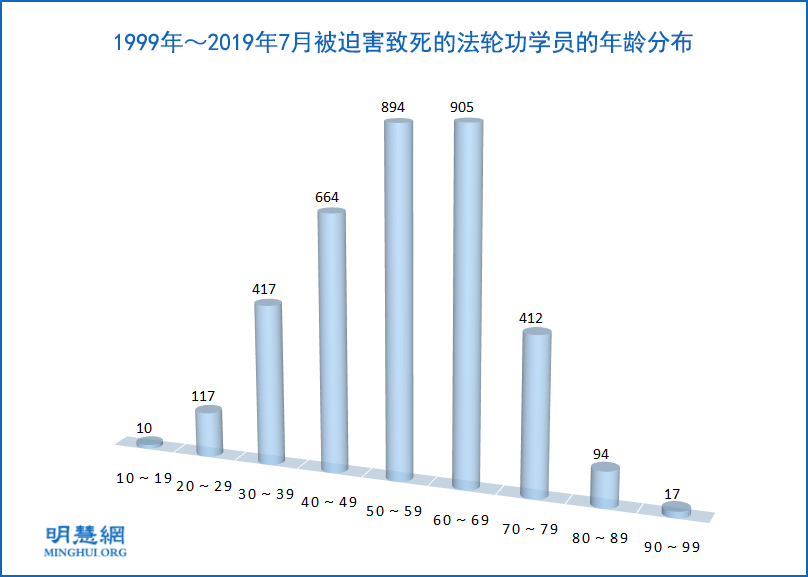 ![]() 图4:1999年~2019年7月被迫害致死的法轮功学员的年龄分布(说明:以上图表只包含死亡年龄确切的迫害致死案例数据) |