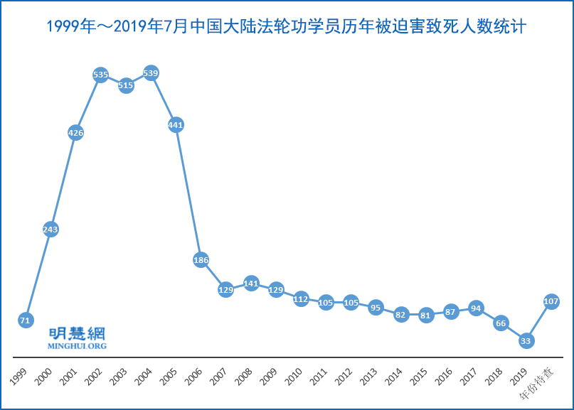 ![]() 图3:1999年~2019年7月中国大陆法轮功学员历年被迫害致死人数统计 |