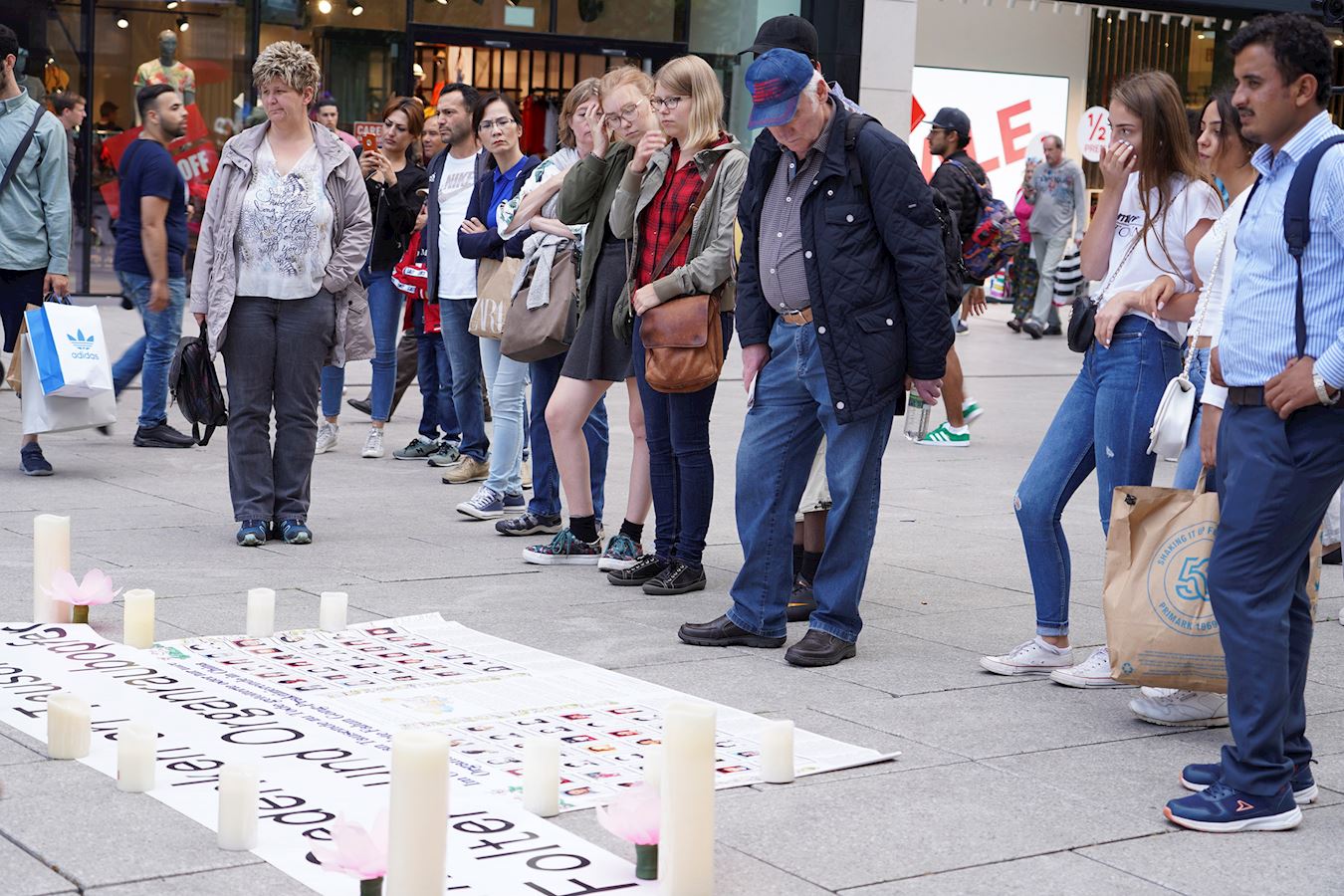 ![]() 图5:在法兰克福市中心,法轮功学员举行烛光夜悼活动,路人驻足认真阅读揭露迫害的信息。 |