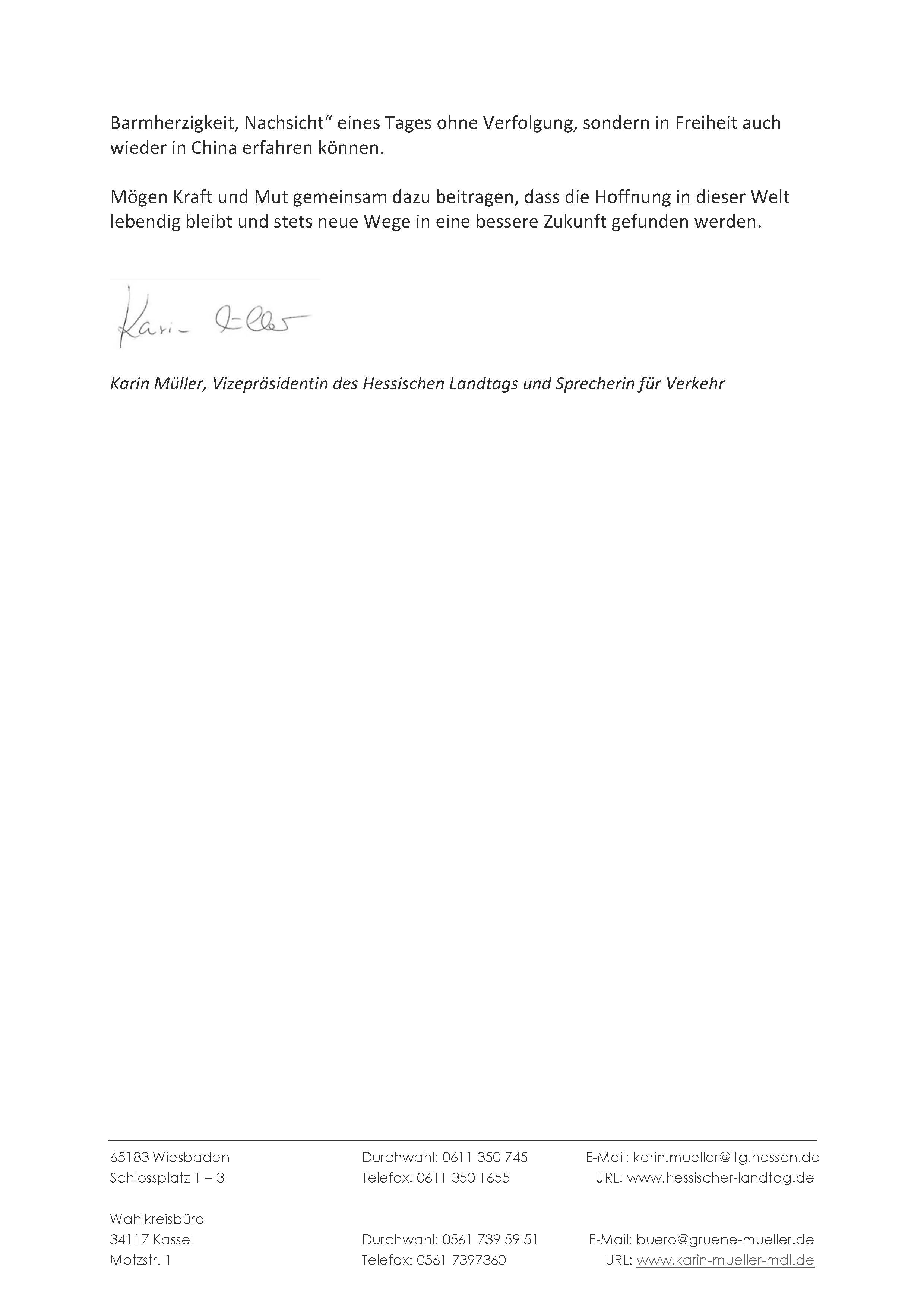 德国国会议员贝婷娜·葳丝蔓(Bettina M. Wiesmann)和黑森州州议会副议长卡琳·穆勒 (Karin Müller)特地给法轮功学员发来致辞。在当天的集会上,法轮功学员用德文和中文向公众传达了她们的正义之声。