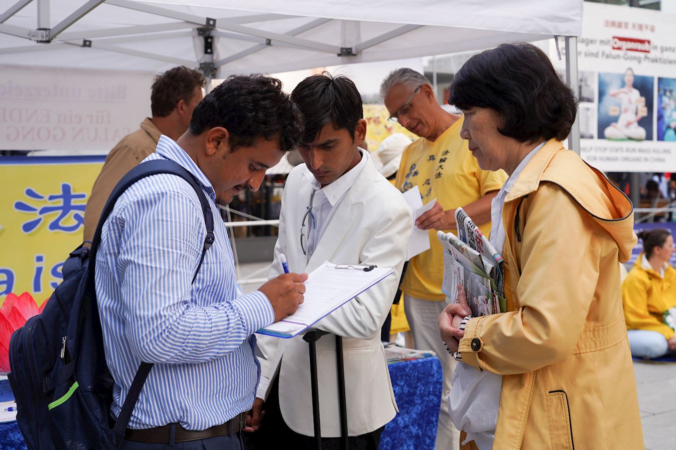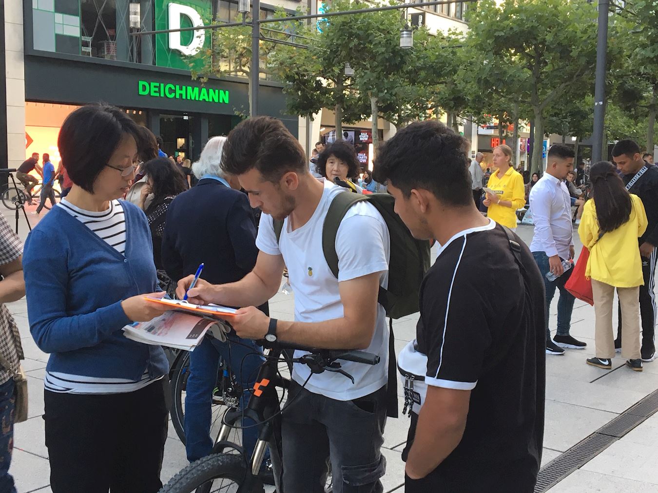 法兰克福是个国际城,容纳了各族裔的民众。活动的当天晚上,很多来自世界各地的民众了解了真相后纷纷签名,声援法轮功学员反对中共的迫害、反对活摘器官的罪行。