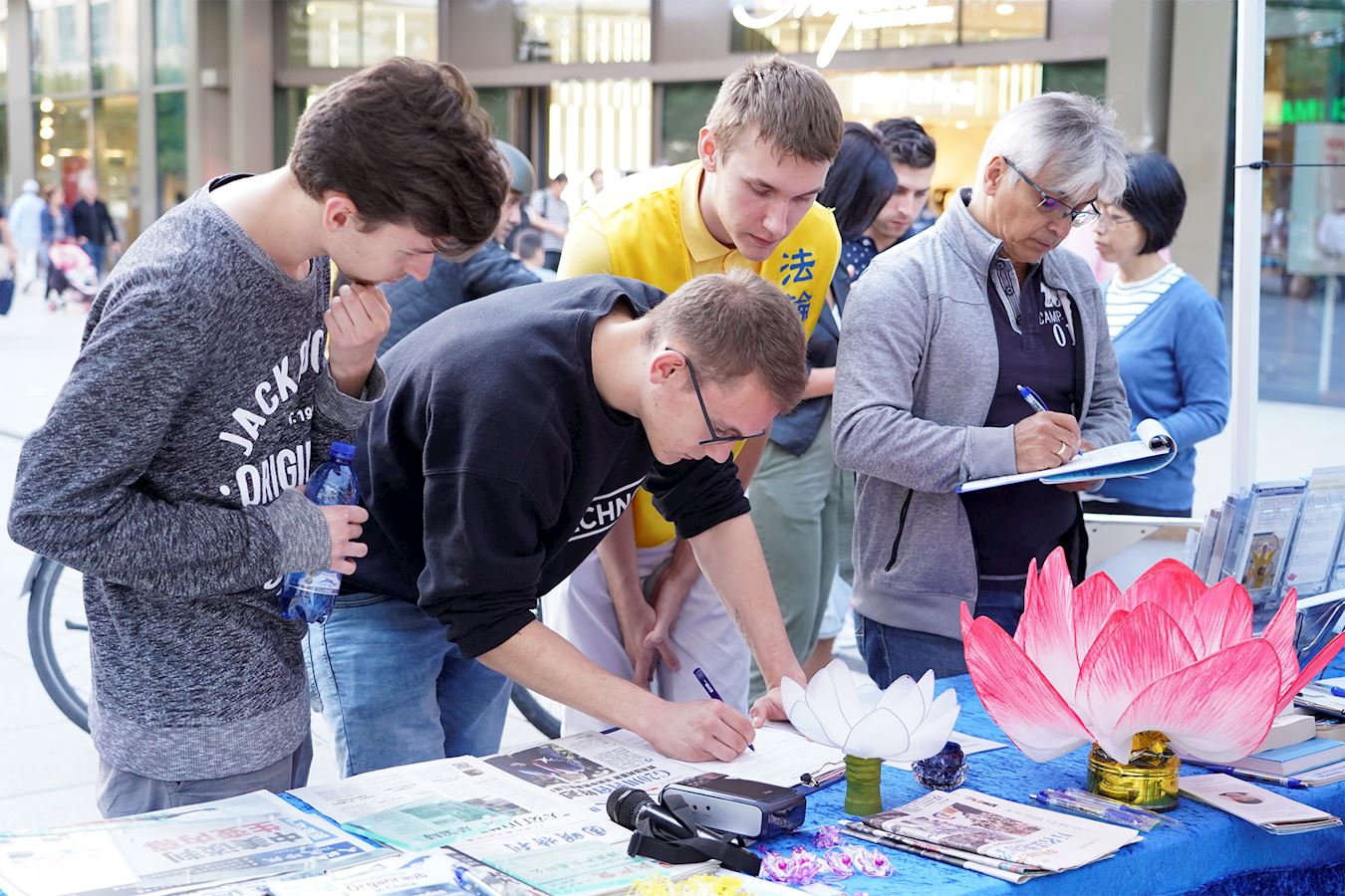 来自波兰的刚刚修炼法轮功一年的年轻女学员Jadzia说,很多人签名反对中共迫害。比如,有一个德国的三口之家,听她讲述中共活摘法轮功学员器官的罪行之后,震惊不已,不敢相信在二十一世纪的今天还有这么残忍的事情发生。三人希望能帮助法轮功学员,便迅速签了名。