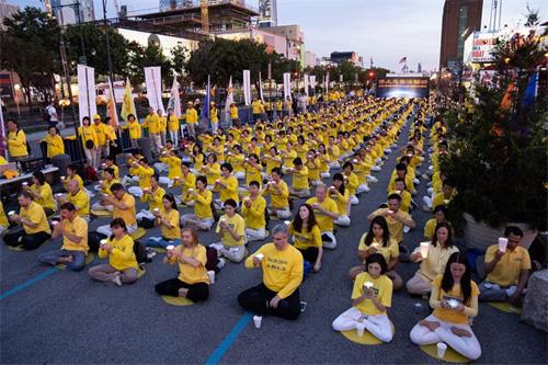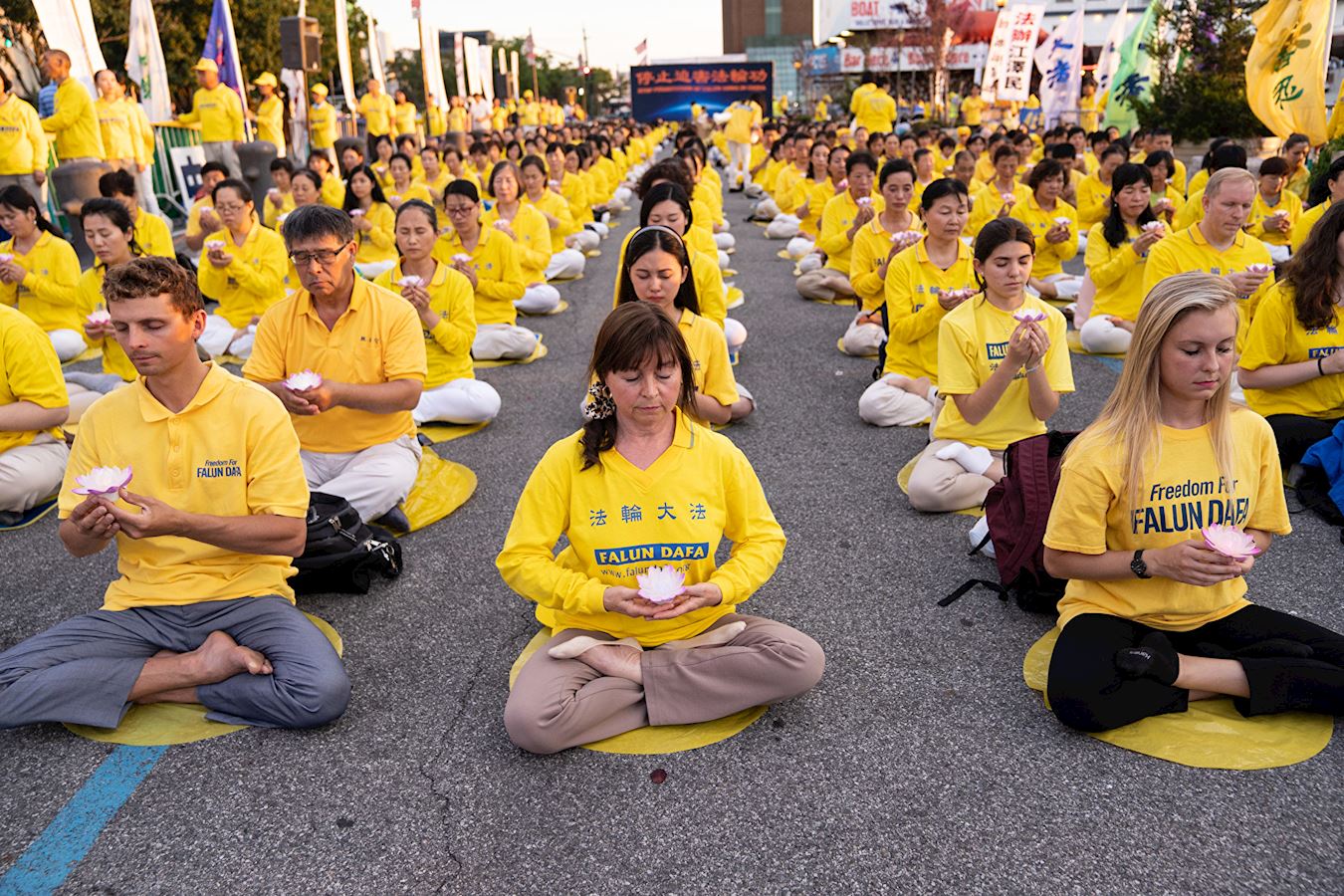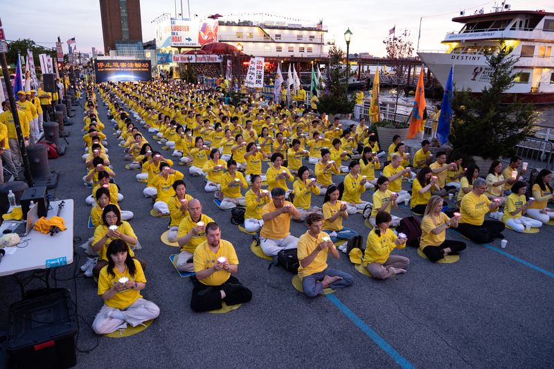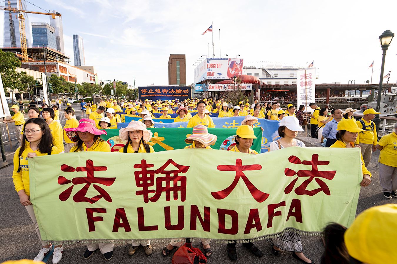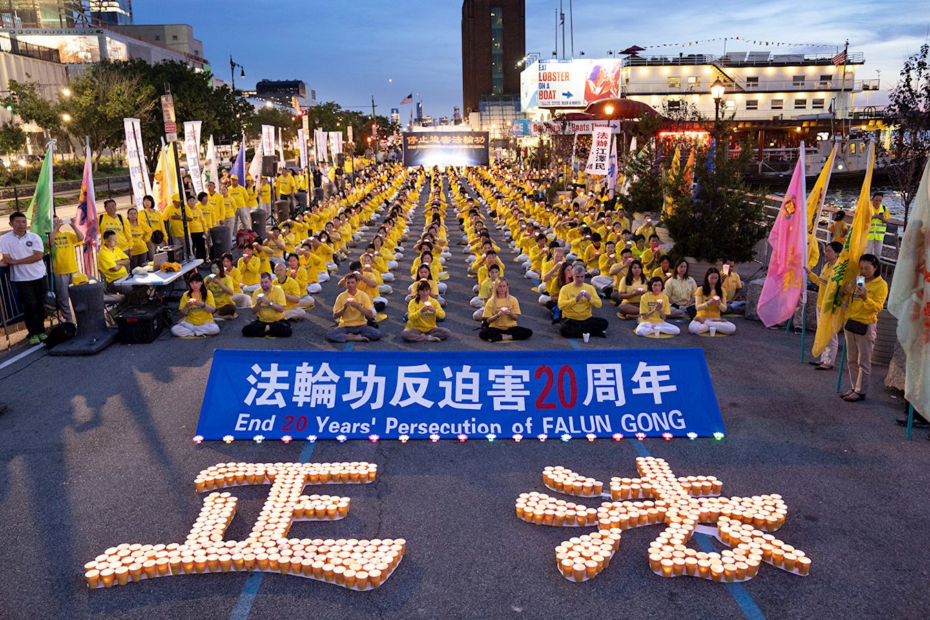 二零一九年七月十五日,千名法轮功学员来到纽约中领馆前,举行集会及烛光夜悼,谴责二十年来中共对法轮功学员的血腥镇压与残酷迫害。悼念被中共迫害致死的法轮功学员。曝光中共对按真善忍做好人的法轮功学员犯下的滔天罪恶。呼唤正义良知,共同制止迫害!中领馆对面哈得遜河边上,法轮功学员打出“停止迫害法轮功”、“全球起诉江泽民”、“法轮大法好”等横幅,他们沿着河岸整齐地席地盘腿而坐,延绵上百米。