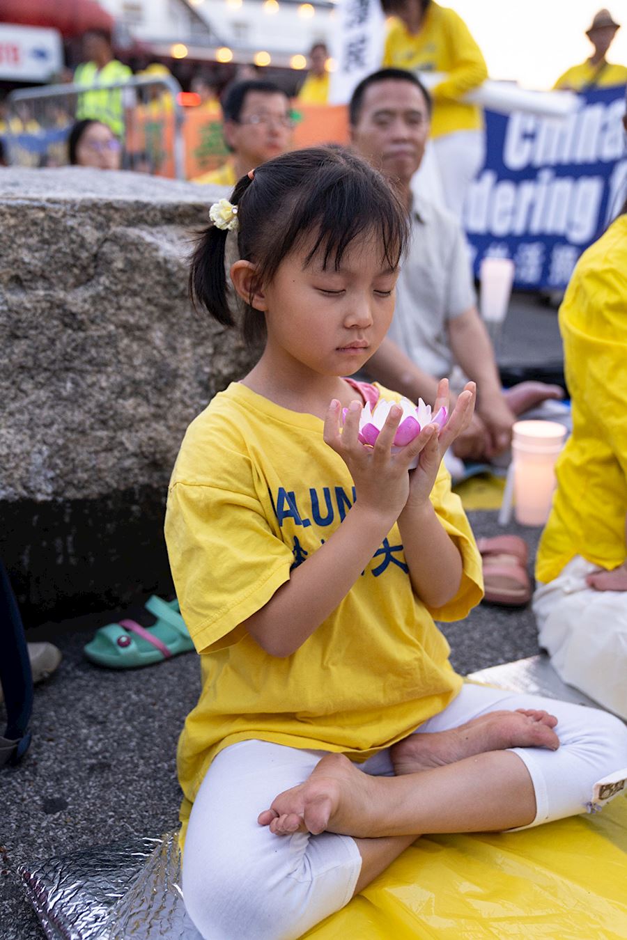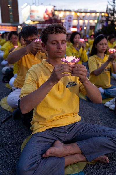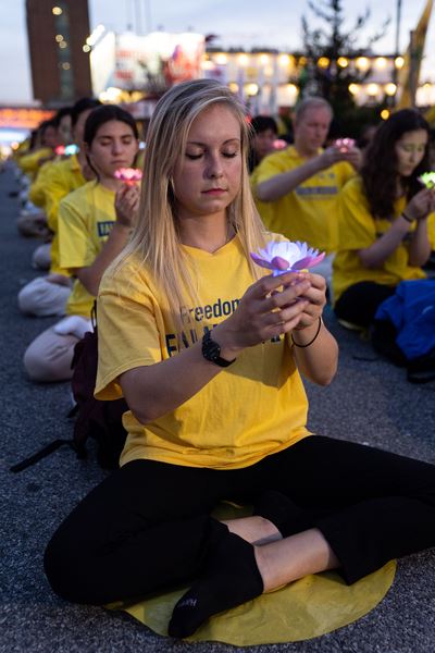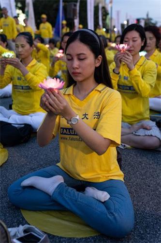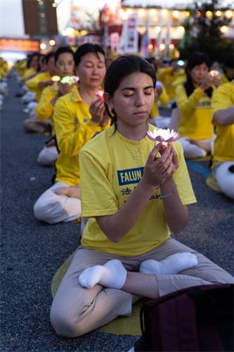 华灯初上,法轮功学员手举蜡烛和莲花灯,默默悼念被迫害致死的法轮功学员,场面肃穆、感人;最前面,由蜡烛组成的“正法”两字灼灼生辉。凉风习习,吹拂着法轮功学员坚韧、善良的面庞。