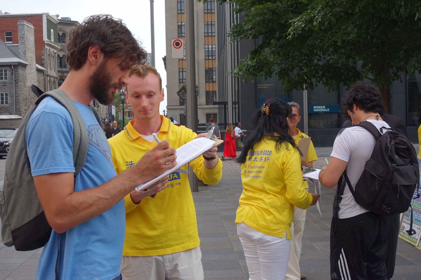 兵器广场是蒙特利尔老城的中心,是游客汇集的知名景点。当日活动从下午6点持续到晚上9点,法轮功学员身着黄衣集体炼功的景象,成为广场上的聚焦点。很多民众上前询问,了解详情后纷纷在呼吁停止迫害的征签信上签字,谴责中共迫害信仰的暴行。有来自中国大陆的中年游客在了解迫害真相后,当场做了三:退.(退出中共党、团、队组织)。