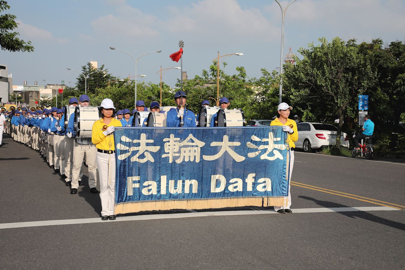 ![]() 图1:由气势磅礴的天国乐团演奏雄壮的乐曲领队,法轮功学员游行队伍出发。 |