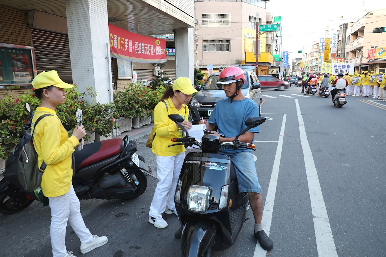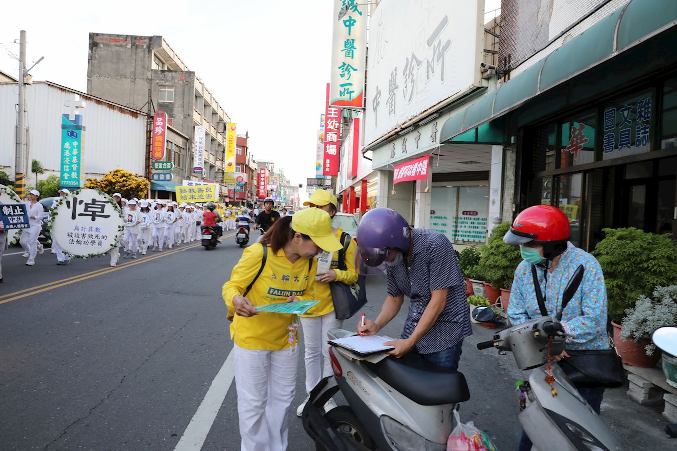 多位学员沿街给鹿港民众及游客发送真相资料,并且征集声援法轮功学员控告江泽民的签名。站在店门口观看游行的施先生在联署书上签下名字。他说不管是任何团体或个人,只要是劝人向善的,他认为就是好的。