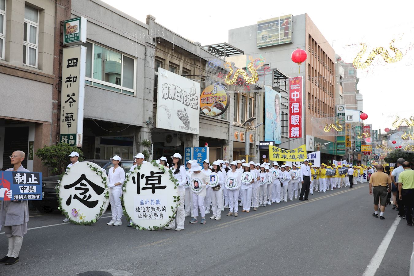 ![]() 图7:学员衣着净白素服,手捧被迫害致死的大陆法轮功学员照片,圣洁静肃行进。 |