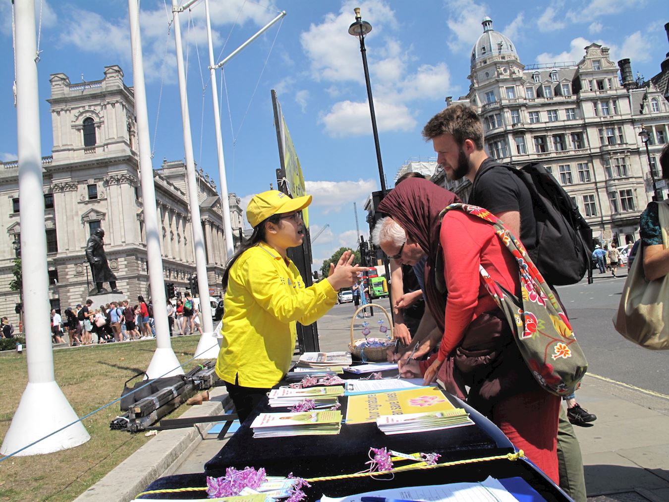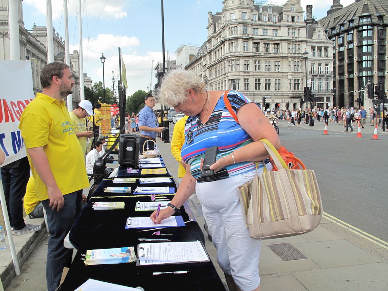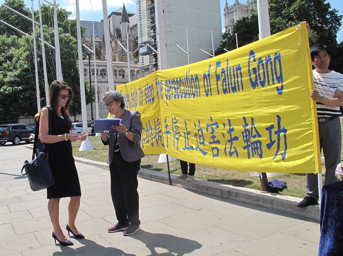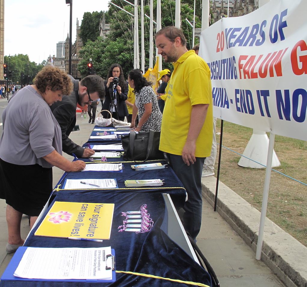 ![]() 图18:二零一九年七月十六日下午,英国女士罗斯(Rose)在英议会大厦外签名支持法轮功学员反迫害 |