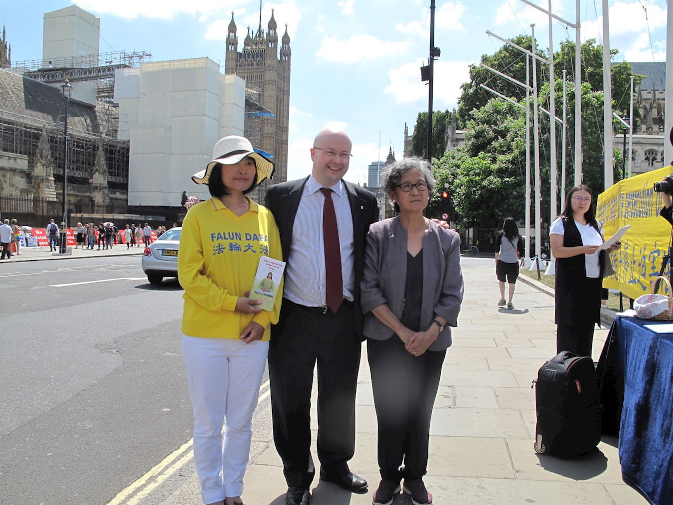 在法轮功反迫害二十年之际,多位国会议员来信表示关切和支持,在七月十六日的集会上,法轮功学员代表宣读了九位国会议员写给英国法轮功学员的支持信。在支持信中: