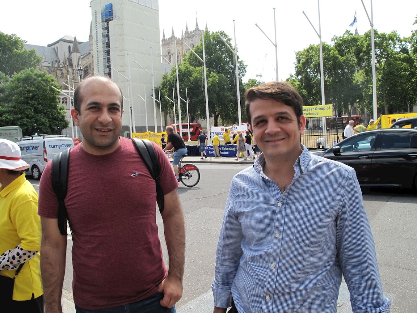 ![]() 图17:两位来自中东国家的记者主动找正在发传单的法轮功学员了解真相 |