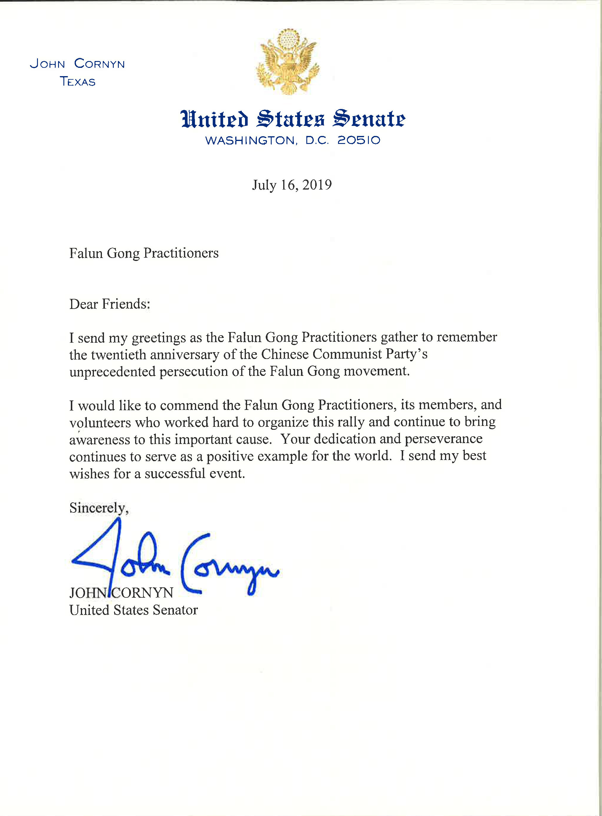 ![]() 图2:联邦参议员约翰‧康尼恩(John Cornyn)的声援信 |