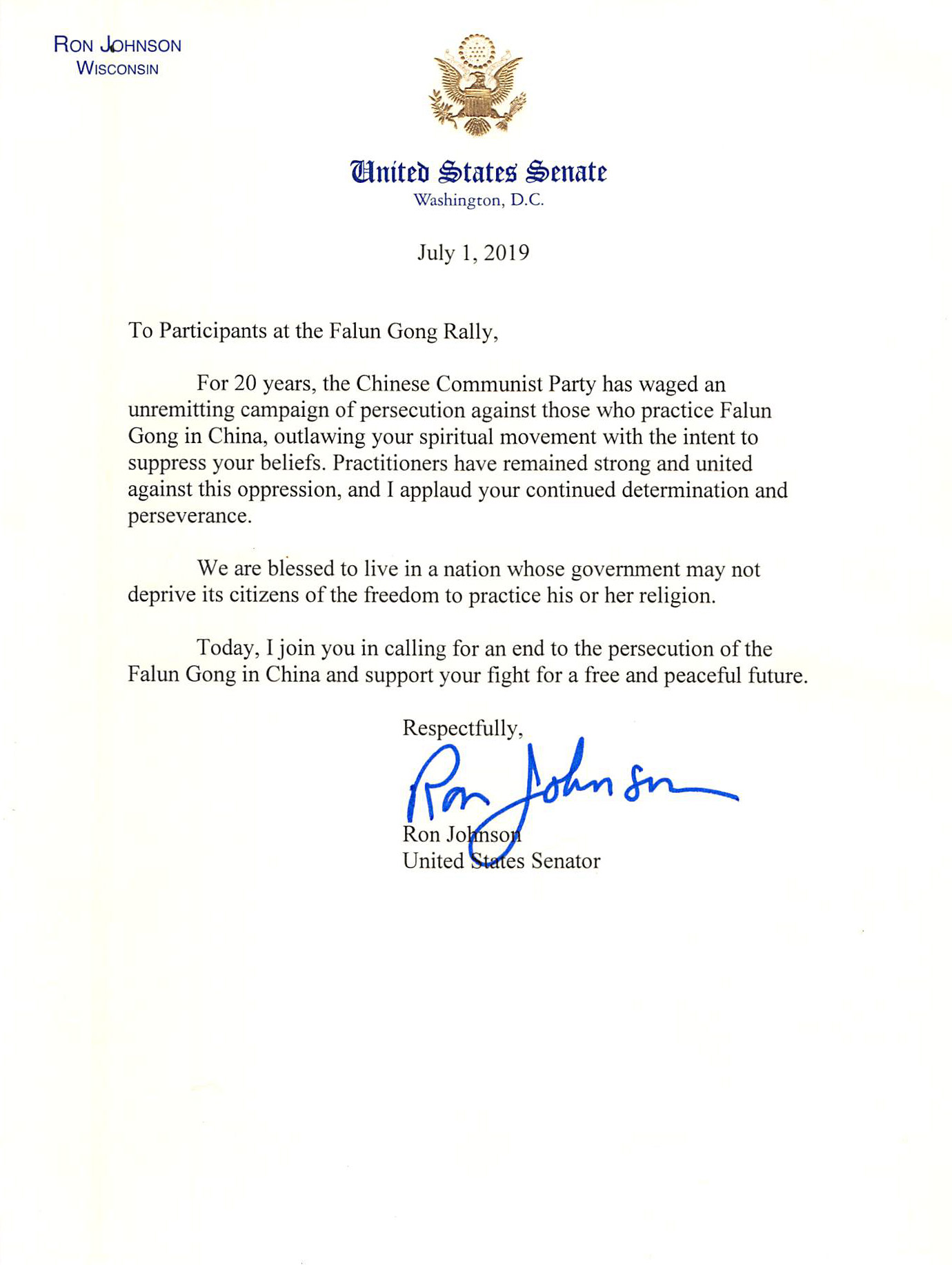 在信中,联邦参议员罗恩‧琼森(Ron Jonson)说:二十年来,中共对中国的法轮功修炼者进行持续迫害,将你们的信仰定为非法,目的是压制你们的信仰。法轮功学员一直坚强不屈,共同抵制这场迫害,我为你们坚毅的决心和意志力喝彩。