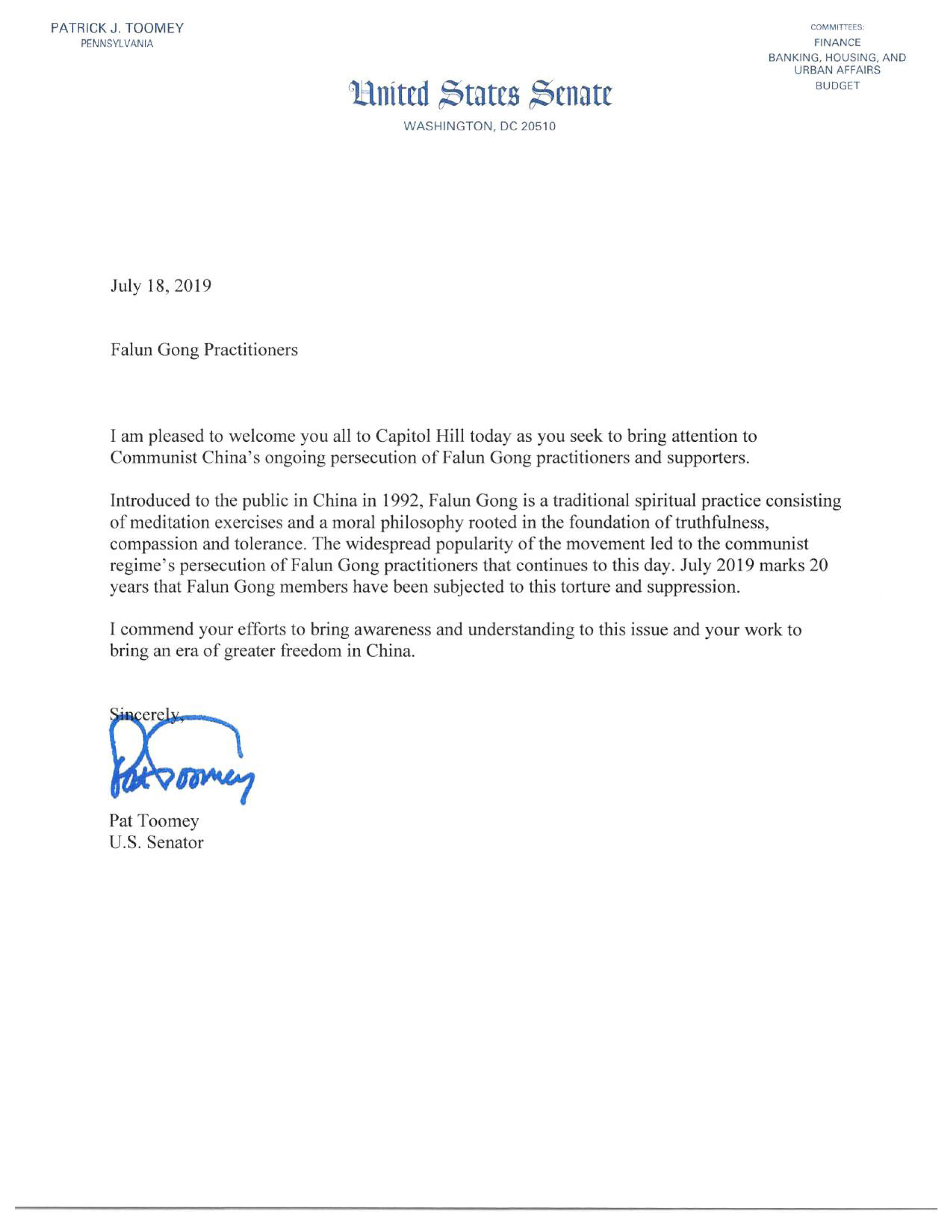 在信中,联邦参议员派翠克‧图米(Patrick J. Toomey)说:欢迎你们大家今天来到国会山,寻求世人关注中共持续迫害法轮功学员及其支持者。
