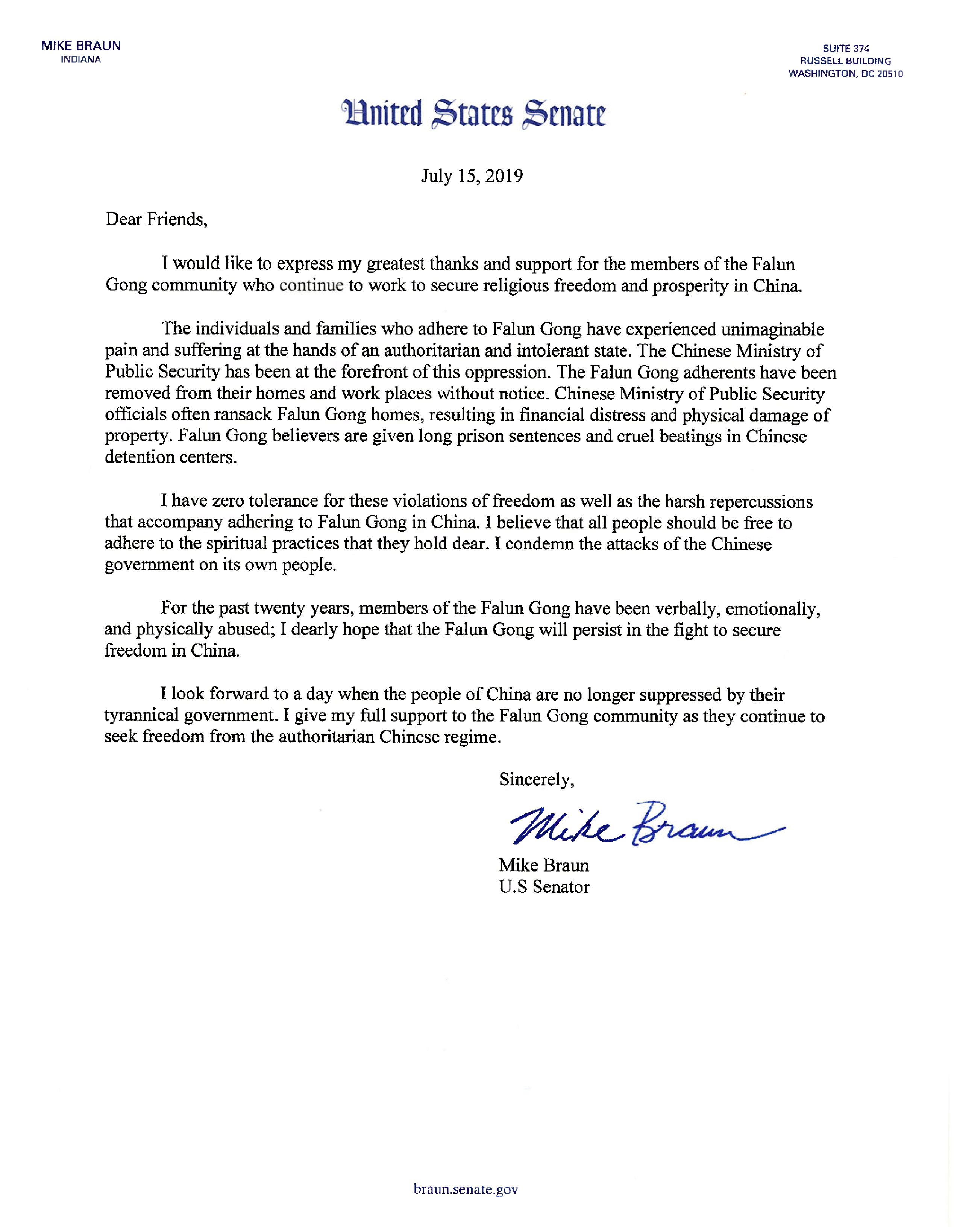 在信中,联邦参议员迈克‧布劳恩(Mike Braun)说:我想表达对法轮功学员的诚挚谢意和支持,他们持续在为中国的宗教自由和繁荣而努力。