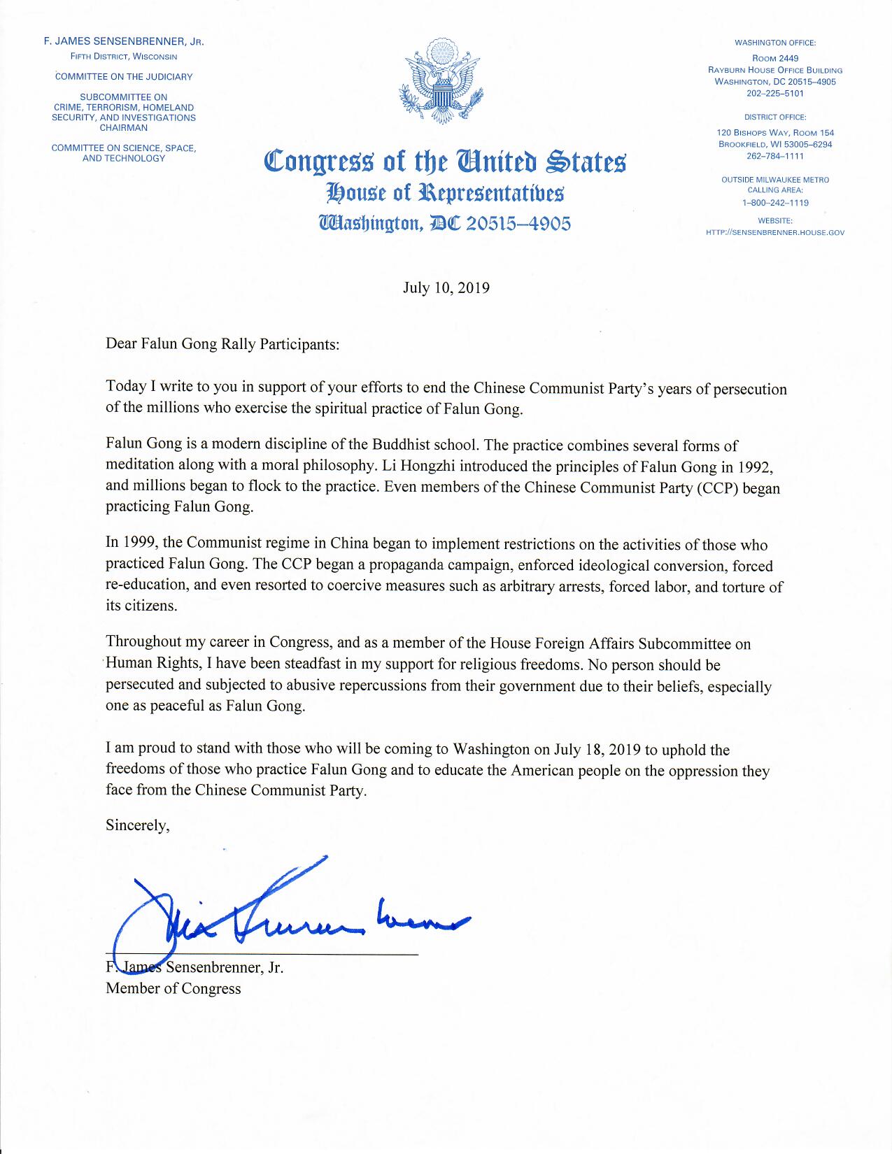 在信中,联邦众议员吉姆‧森森布雷纳说:我今天致信支持你们付出的努力,为结束中共多年来对数百万法轮功修炼者的迫害。