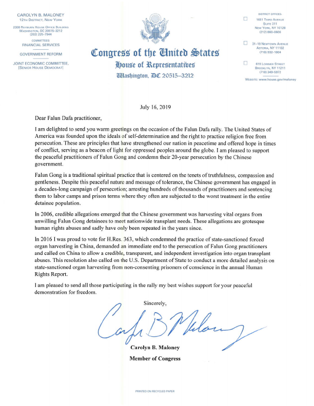 在信中,联邦众议员卡罗琳‧马洛尼(Carolyn Maloney)说:我很高兴支持平和的法轮功学员,并谴责中共政府二十年的迫害。