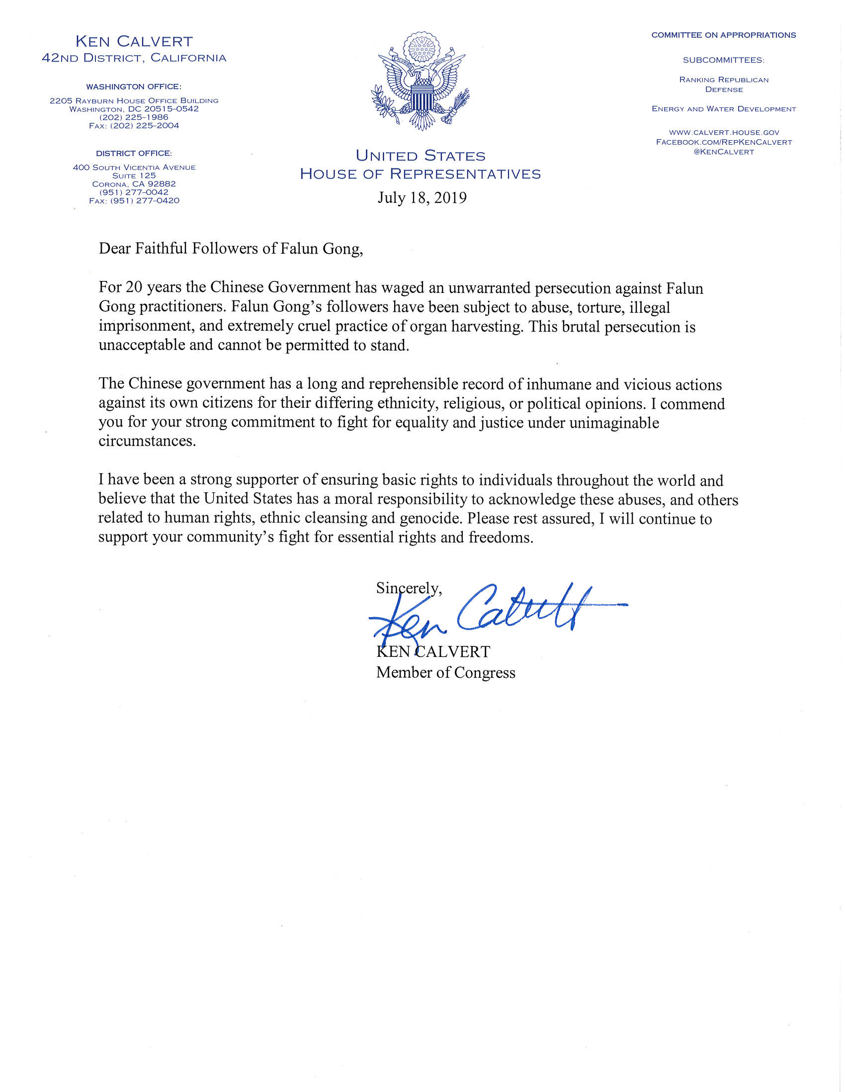 在信中,联邦众议员卡肯‧卡尔沃特(Ken Calvert)说:中共政府毫无理由地对法轮功学员发起的迫害已经持续了二十年,法轮功学员一直受到虐待、酷刑迫害、非法囚禁,并且被极其残酷地强摘器官。这种残暴的迫害是令人无法忍受的,不能任其继续下去。
