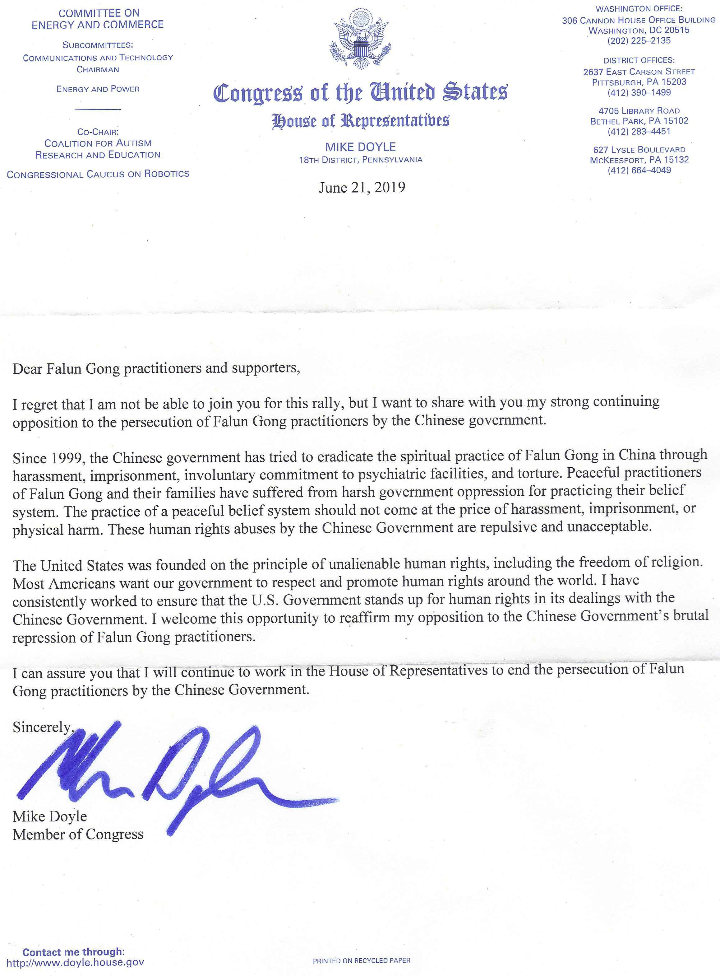 在信中,联邦众议员迈克‧多伊尔(Mike Doyle)说:很遗憾我不能和你们一起参加这次集会,但我想对你们说,我一如既往地强烈反对中共政府迫害法轮功。