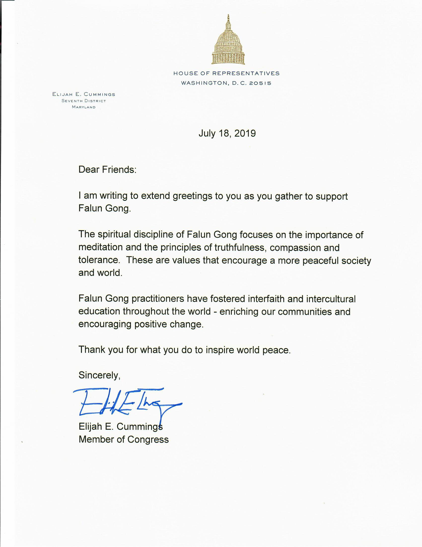 在信中,联邦众议员以利亚‧卡明斯(Elijah E. Cummings)说:在你们集会声援法轮功之际,我写信向你们表达问候。